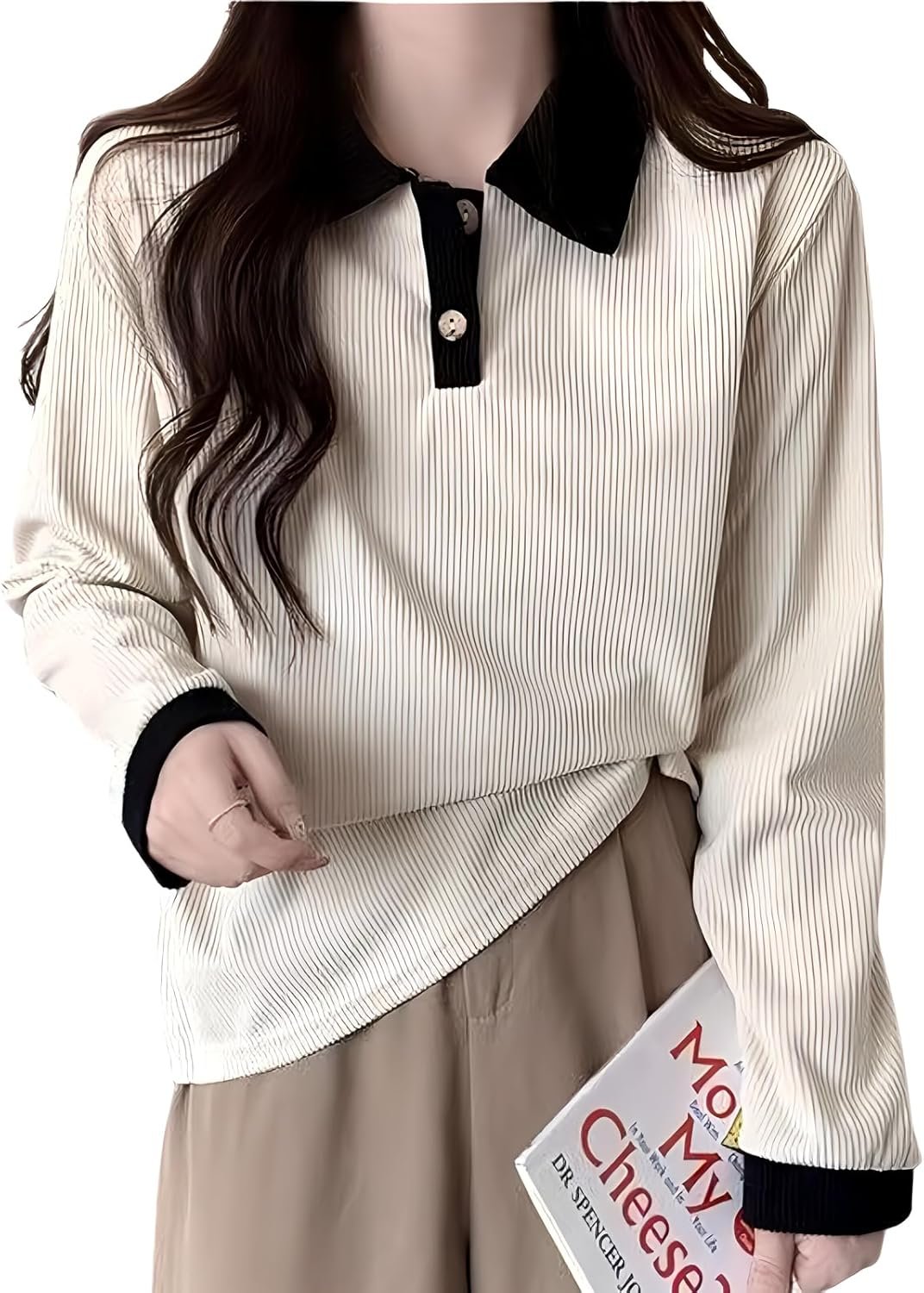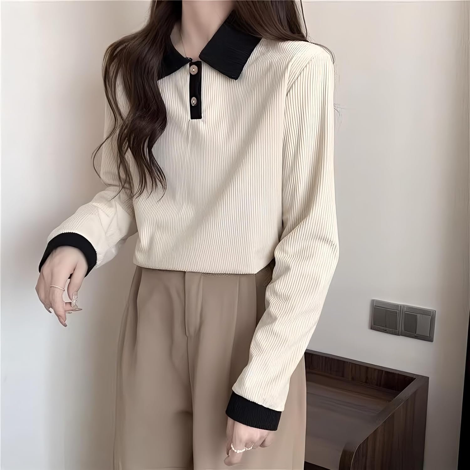 Yasauri Women’s Knit Polo、長袖、リブ、オフィスカジュアル、長袖、春、秋、襟、通勤、カットと縫い、ポロシャツ、韓国
