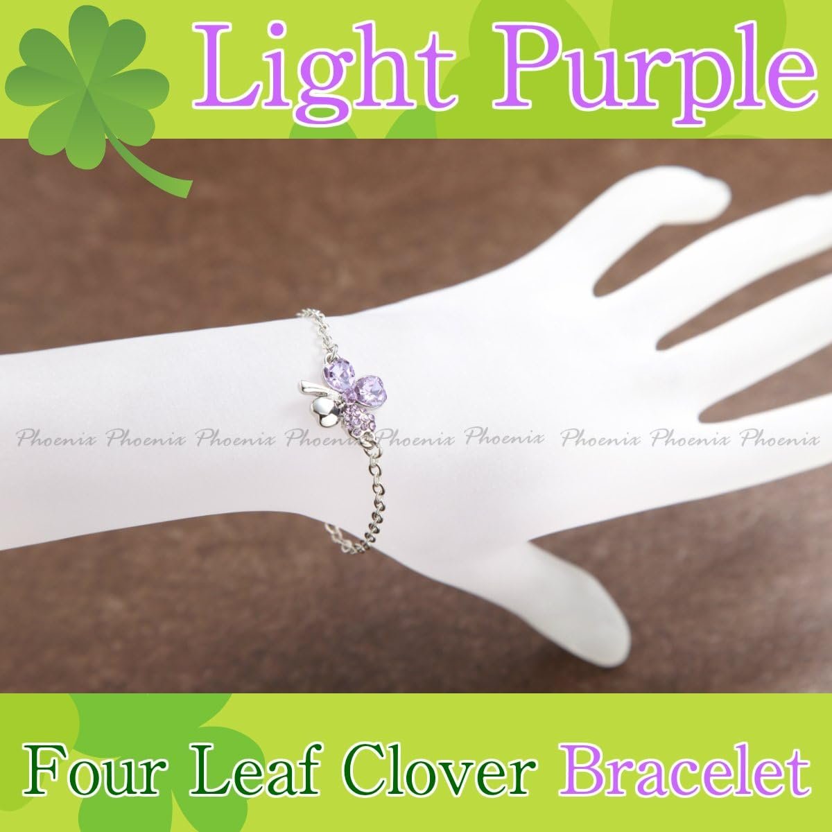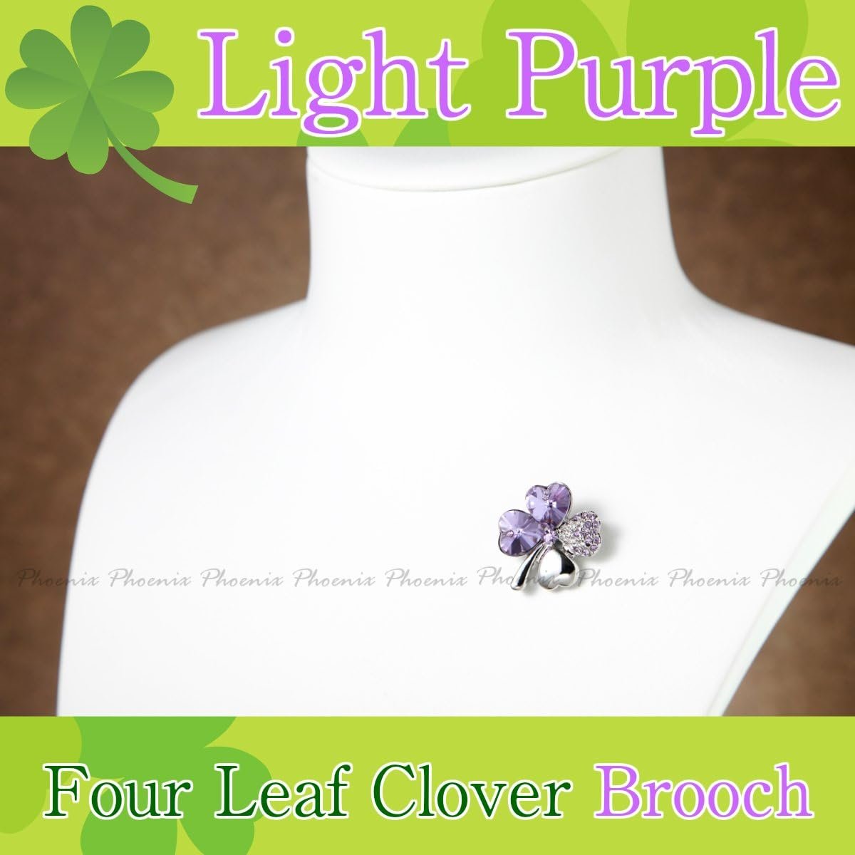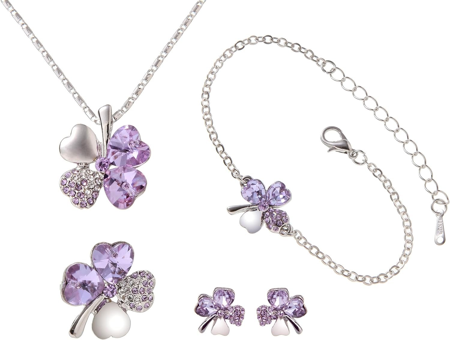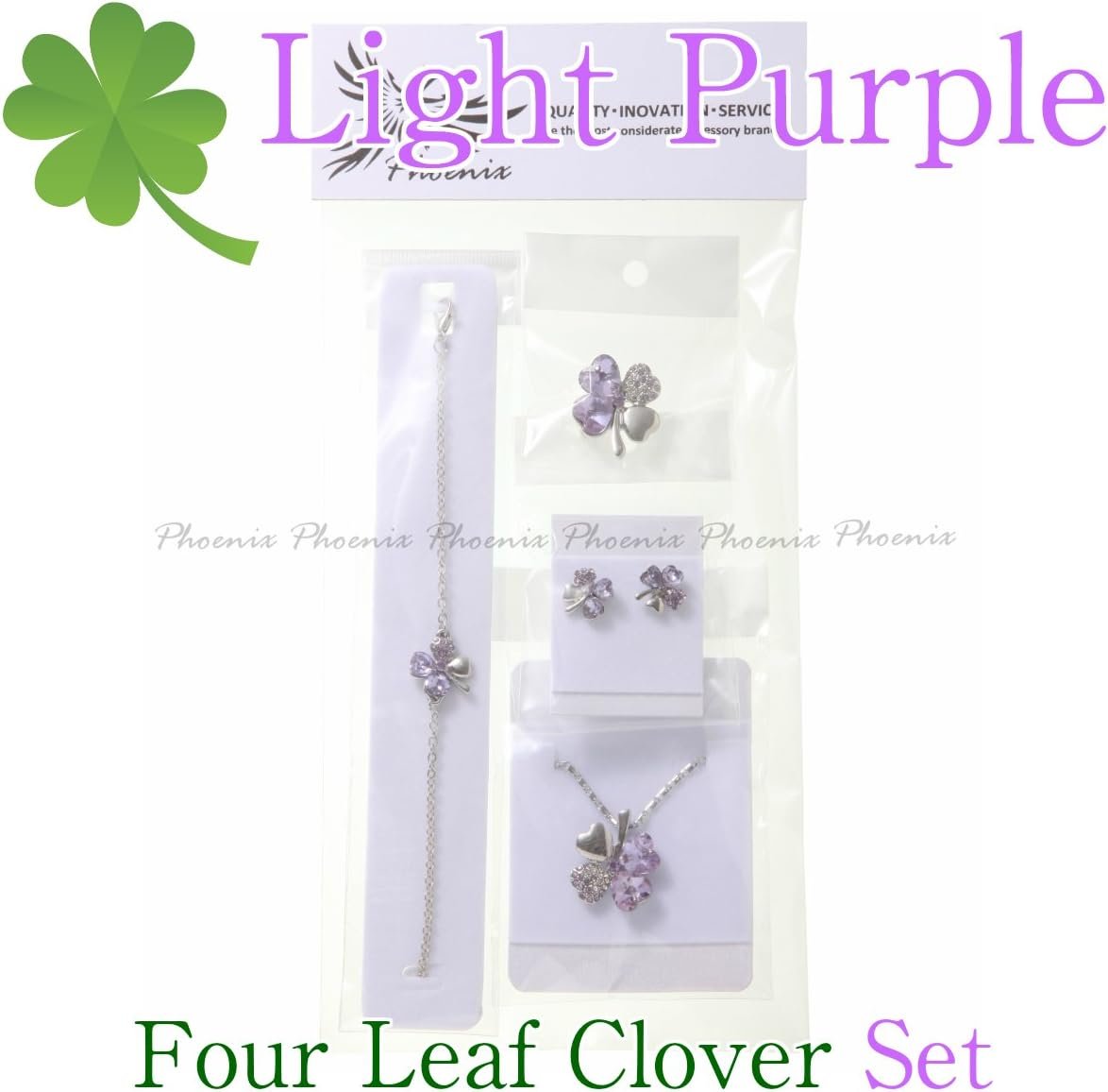 フェニックスラッキーフォーリーフクリスタルクローバーネックレス&ブレスレット&イヤリング&ブローチ合計4ピースセット、Quartz