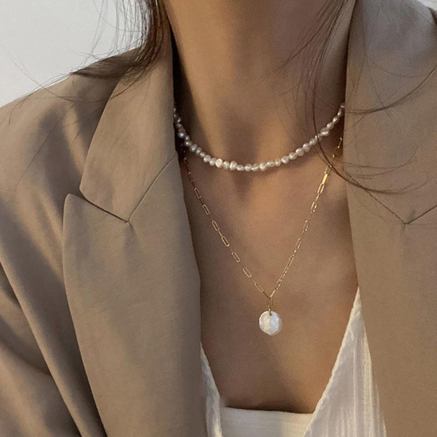 2022新しいヴィンテージ不規則パールジュエリーゴールドメッキ分厚いリンクチェーンレイヤードネックレス女性パールネックレス-Choker