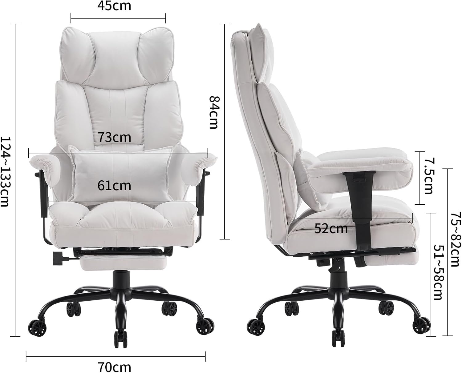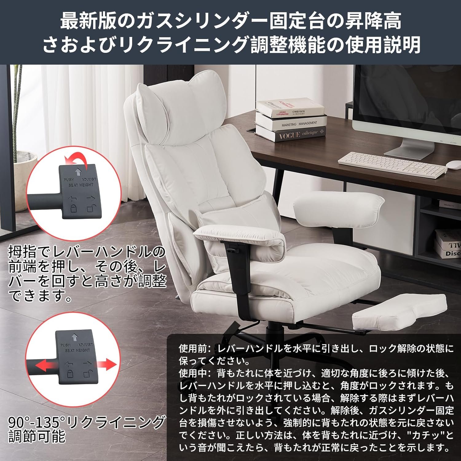 [90 – 135° Reclining & Locking Function] リクライニング角度をお好みの位置に調整できます。休みたいときに調整して休憩します。最も過酷な作業中に椅子のロック機構を使用することもできます。椅子に沿って揺れると、心身がリラックスして楽しくなり、ストレスが軽減され、仕事の効率が向上します。