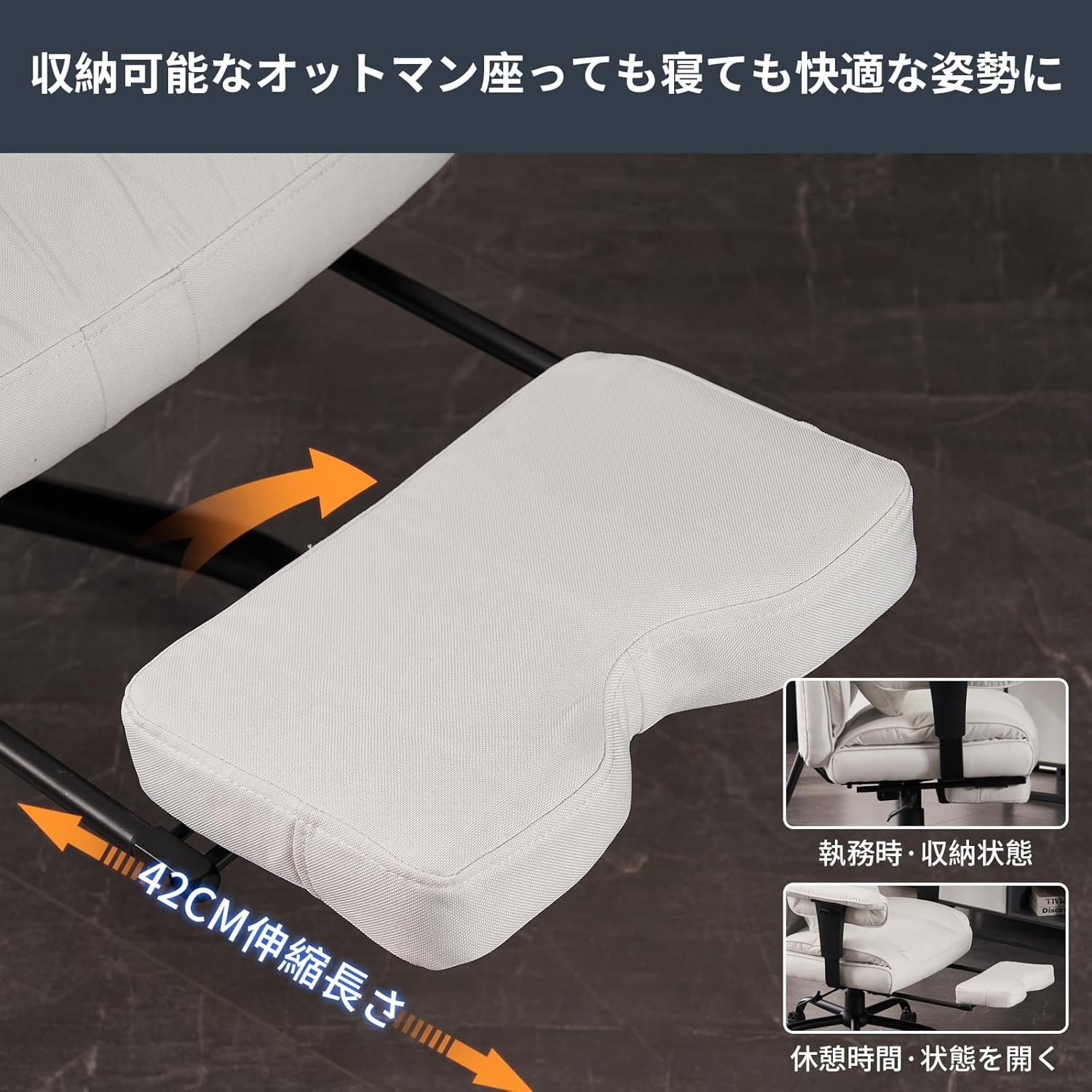 収納式のオットマンも付属しており、足を伸ばしてリラックスできる快適な環境を提供します。