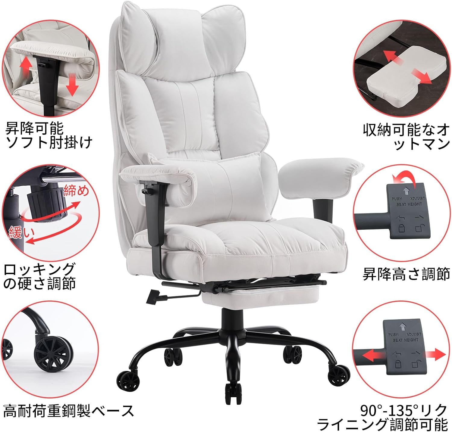 【組み立て簡単&多機能ゲーミングチェア】組み立てが簡単で、専用の組み立て工具セットと日本語取扱説明書が付属しています。椅子は20~30分程度で簡単に組み立てられます。背もたれは135度まで調整でき、椅子は360度回転でき、座面の高さは柔軟です。収納可能なオットマンも付いています。アームレストは高さ調節可能で、調節範囲は約7.5cmです。椅子はテーブルの下に簡単に収納できます。アームレストの表面は柔らかく快適で、肘への圧力を軽減し、同時に肘を完璧な位置に保ちます。