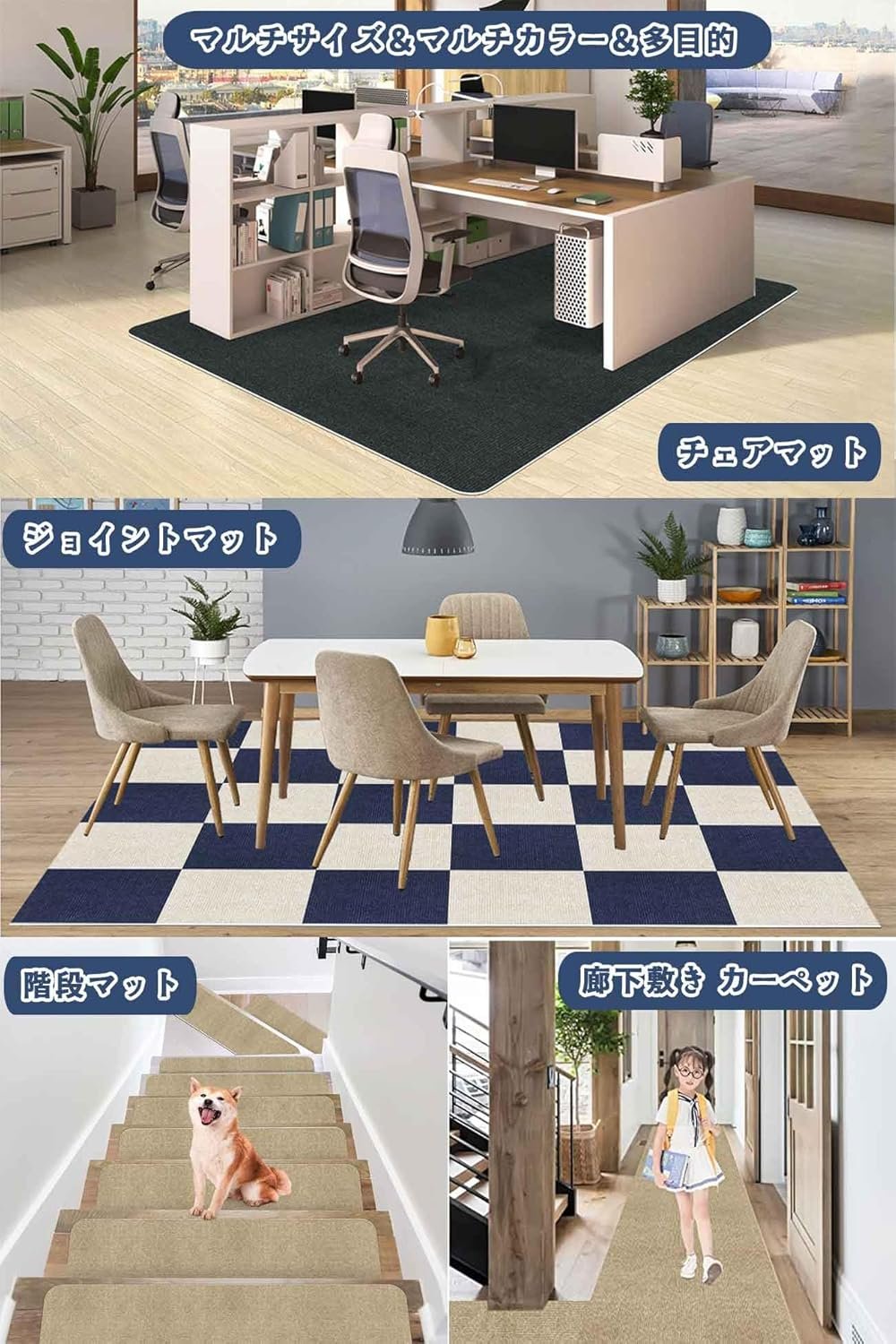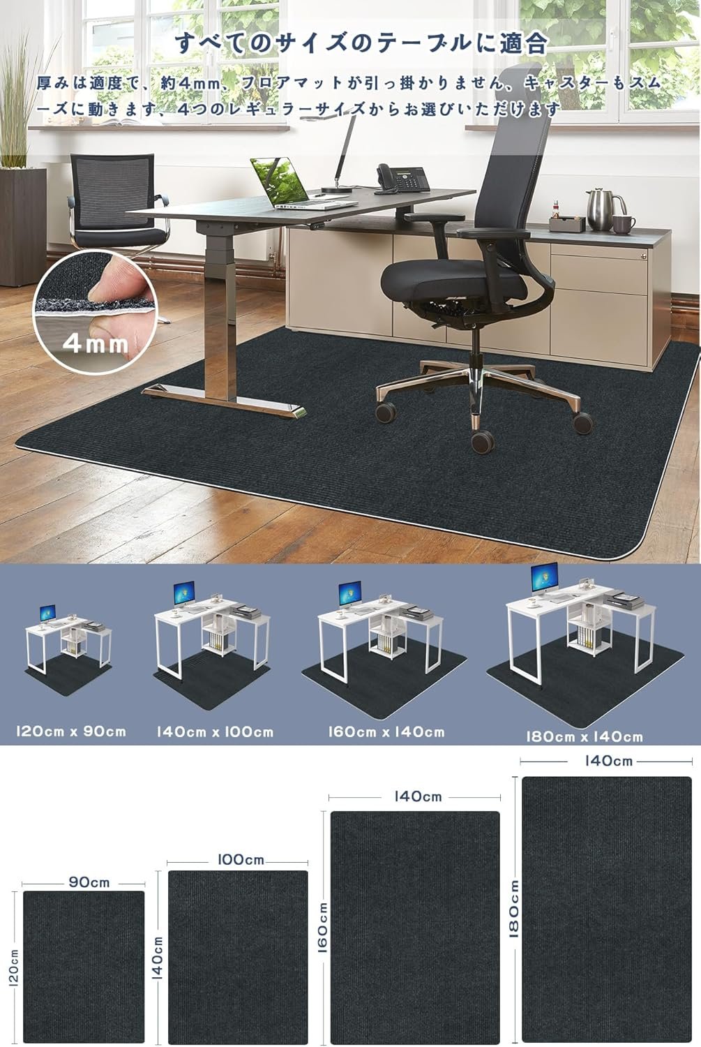 -騒音低減と耐傷性デスクチェアマット:この最新タイプのカーペットチェアマットは、キャスターが転がる際の騒音を効果的に吸収して低減し、床を保護します。また、チェアクッションマットはわずか4mmなので、足元を気にせず楽に移動できます。