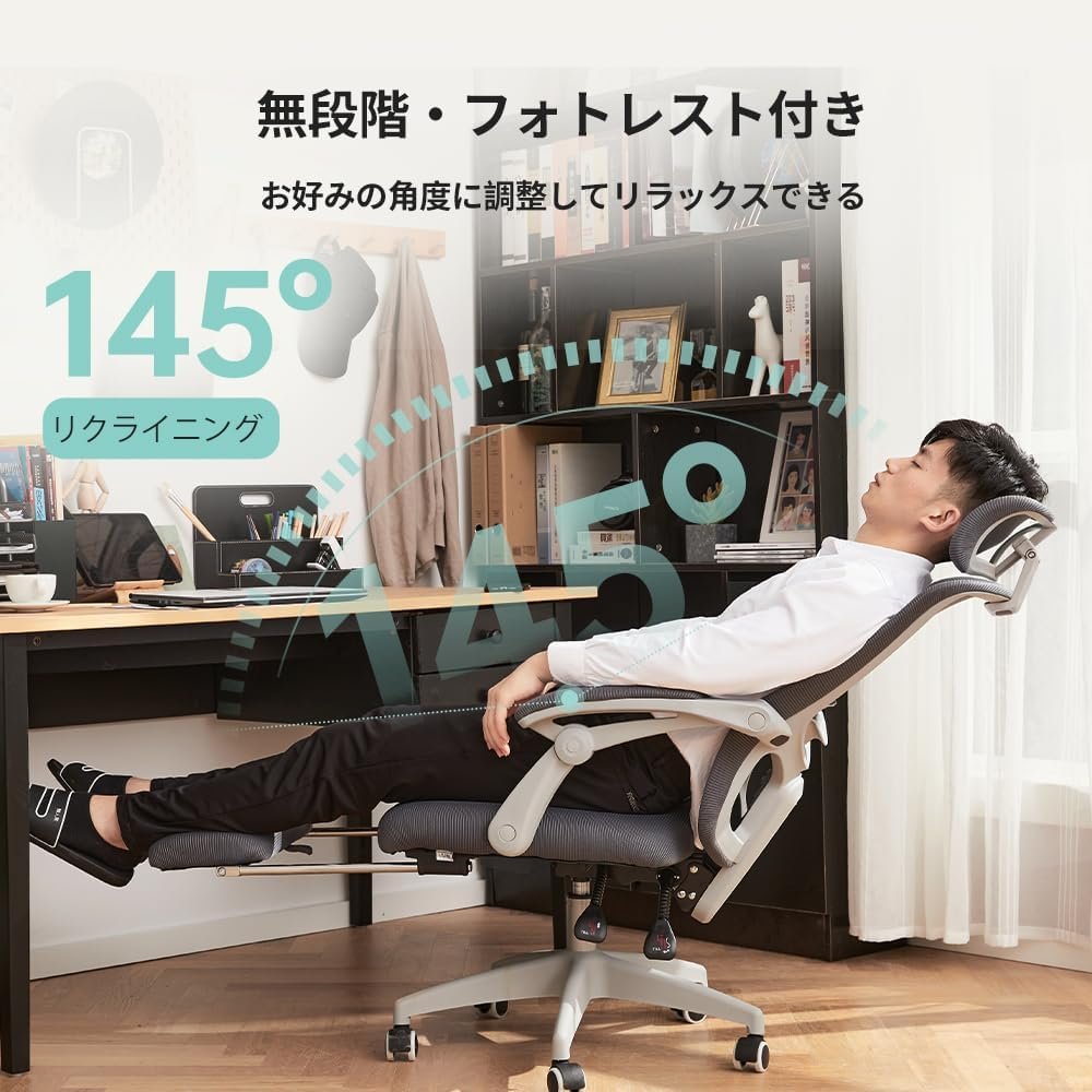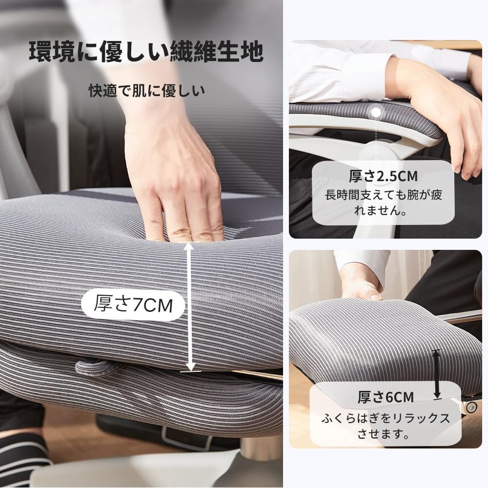「145°リクライニングとフットレスト」仕事中に休憩を取りたい場合、または昼休みをとる場合でも、このオフィスチェアリクライニングチェアを使用できます。大きな145度のリクライニング角度は、仕事、読み取り、ゲームのプレイなどに快適にするために、任意の角度で固定できます。6cmの厚さのフットレストを引き出して、すぐに昼寝に最適なベッドになり、足のしびれの問題を解決し、最高の休息体験を得ることができます。連動しているアームレストは常に腕をサポートし、リクライニング角度に従って肘がたるみを防ぎます。通常のナイロンアームレストと比較して、このアームレスト2.5cmの厚さのソフトレイヤーはより快適で、腕の疲労を引き起こしません