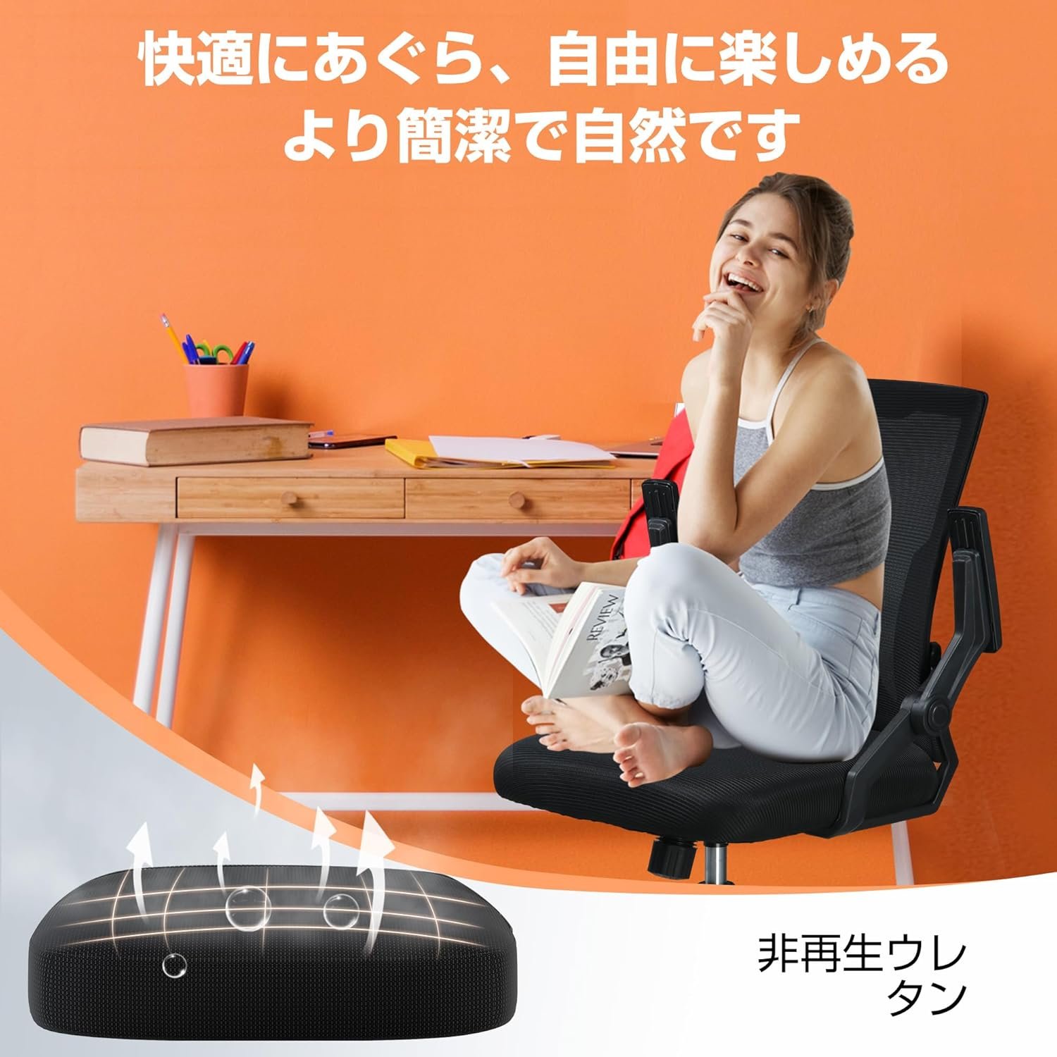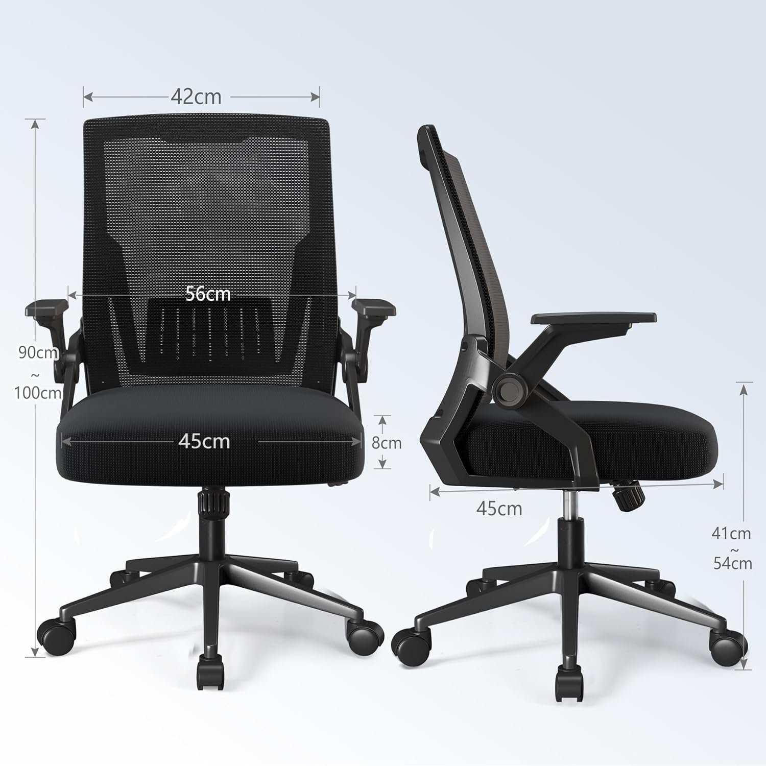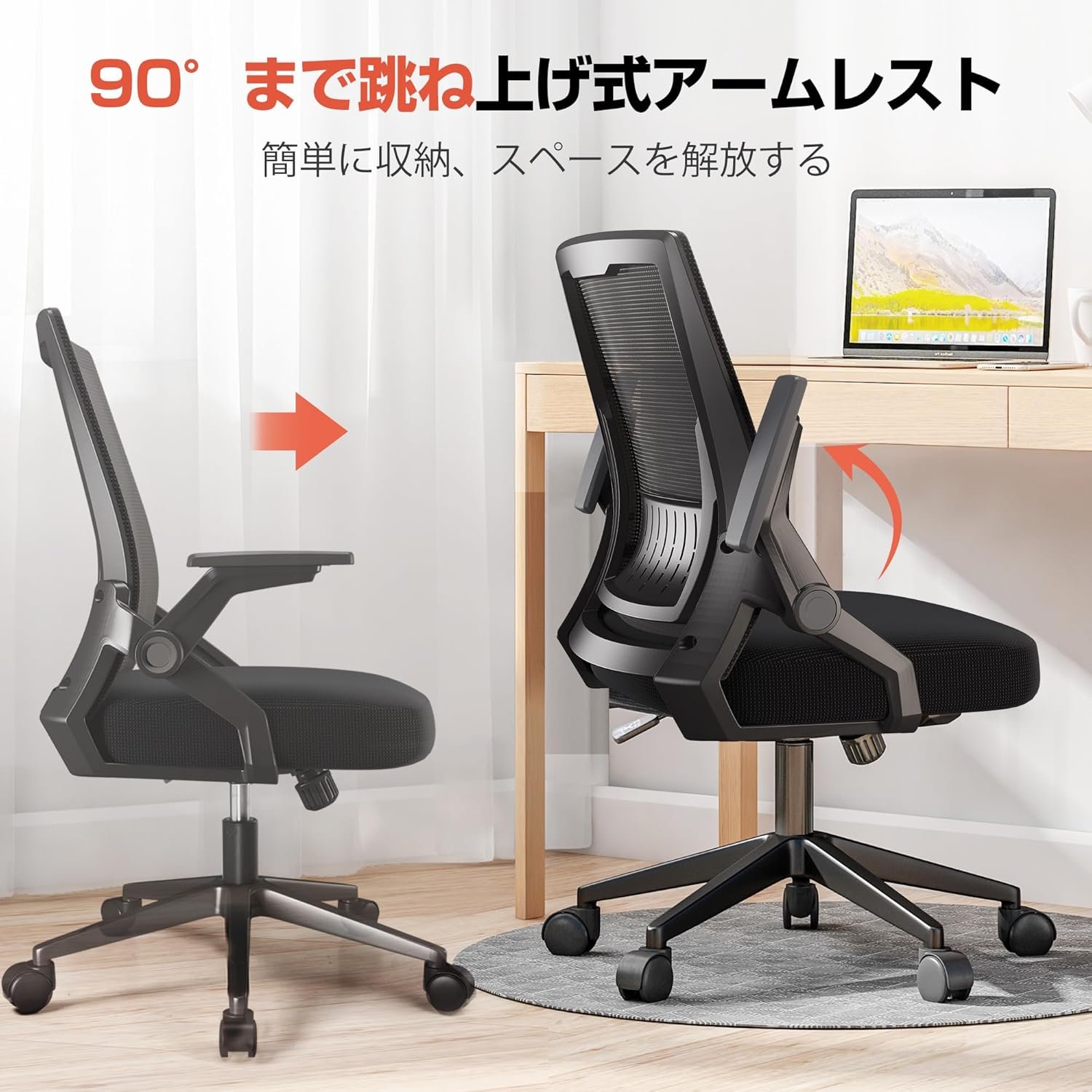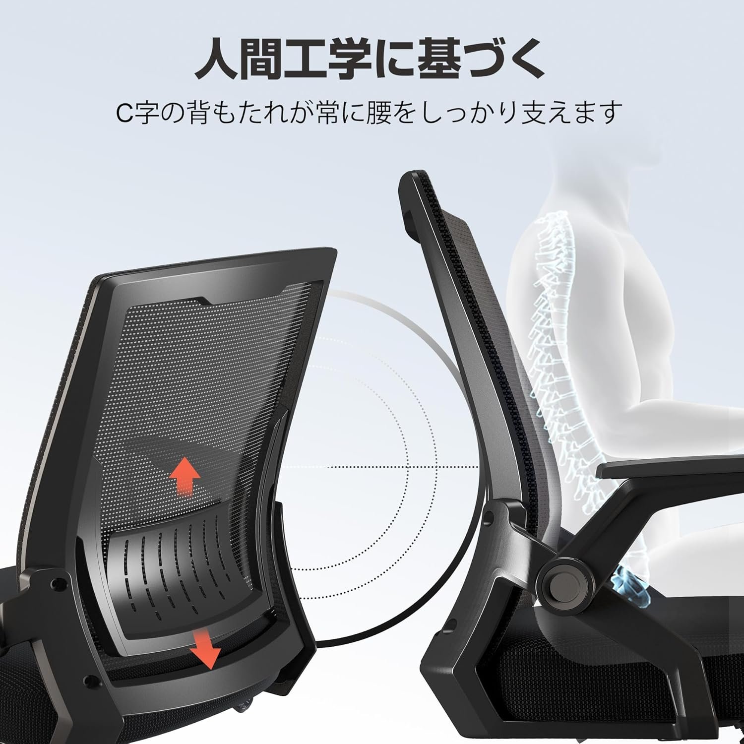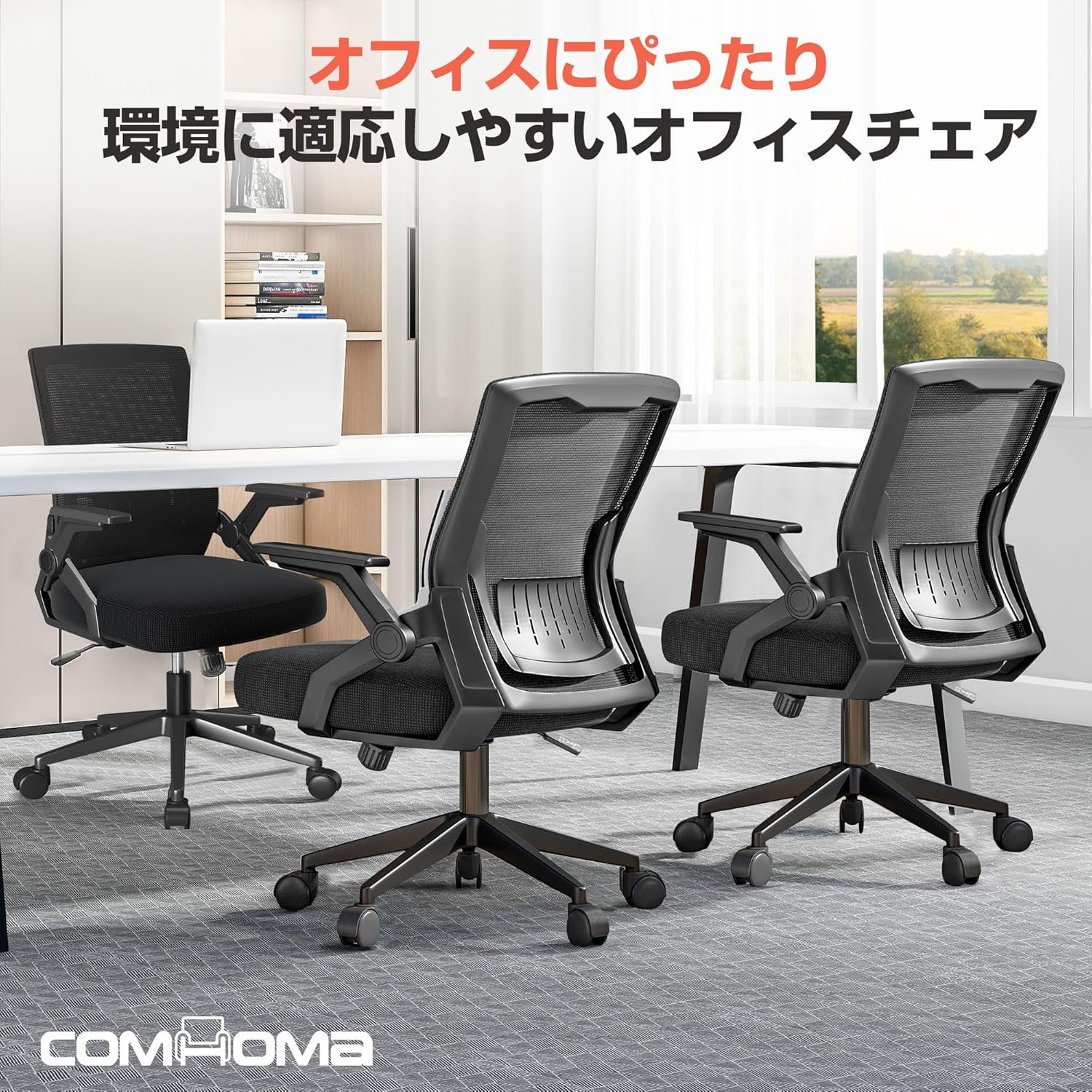 コモマCH219ダークブラックデスクチェア、オフィスチェア、テレワーク、アンチ疲労、メッシュ、人間工学的、C字型腰部サポート、回復力のあるバックレスト、イージーバック、メッシュ、フリップアップアームレスト、在宅勤務、在宅勤務、