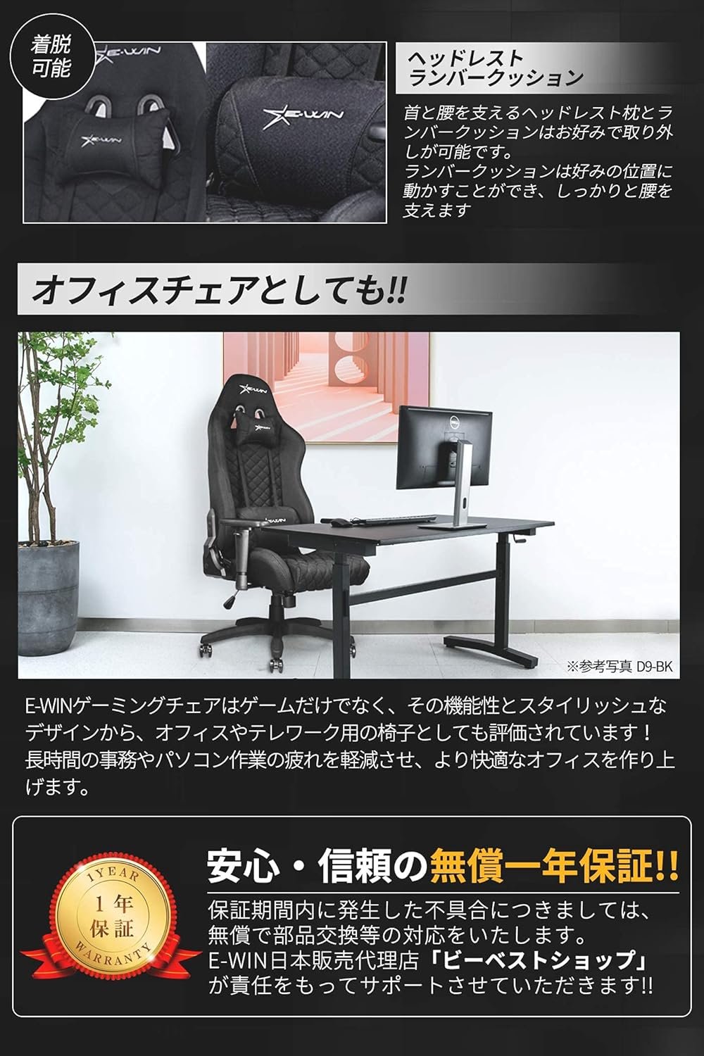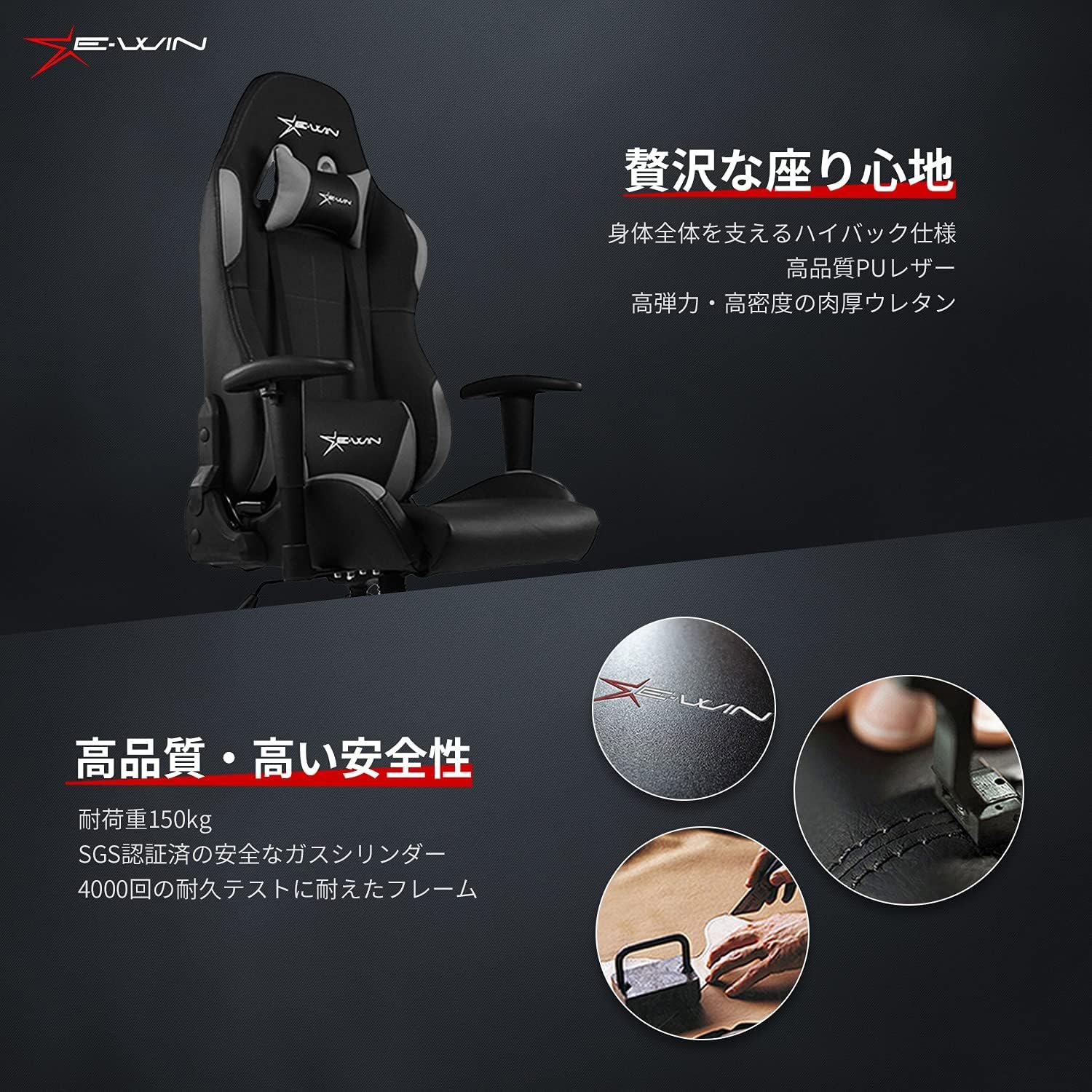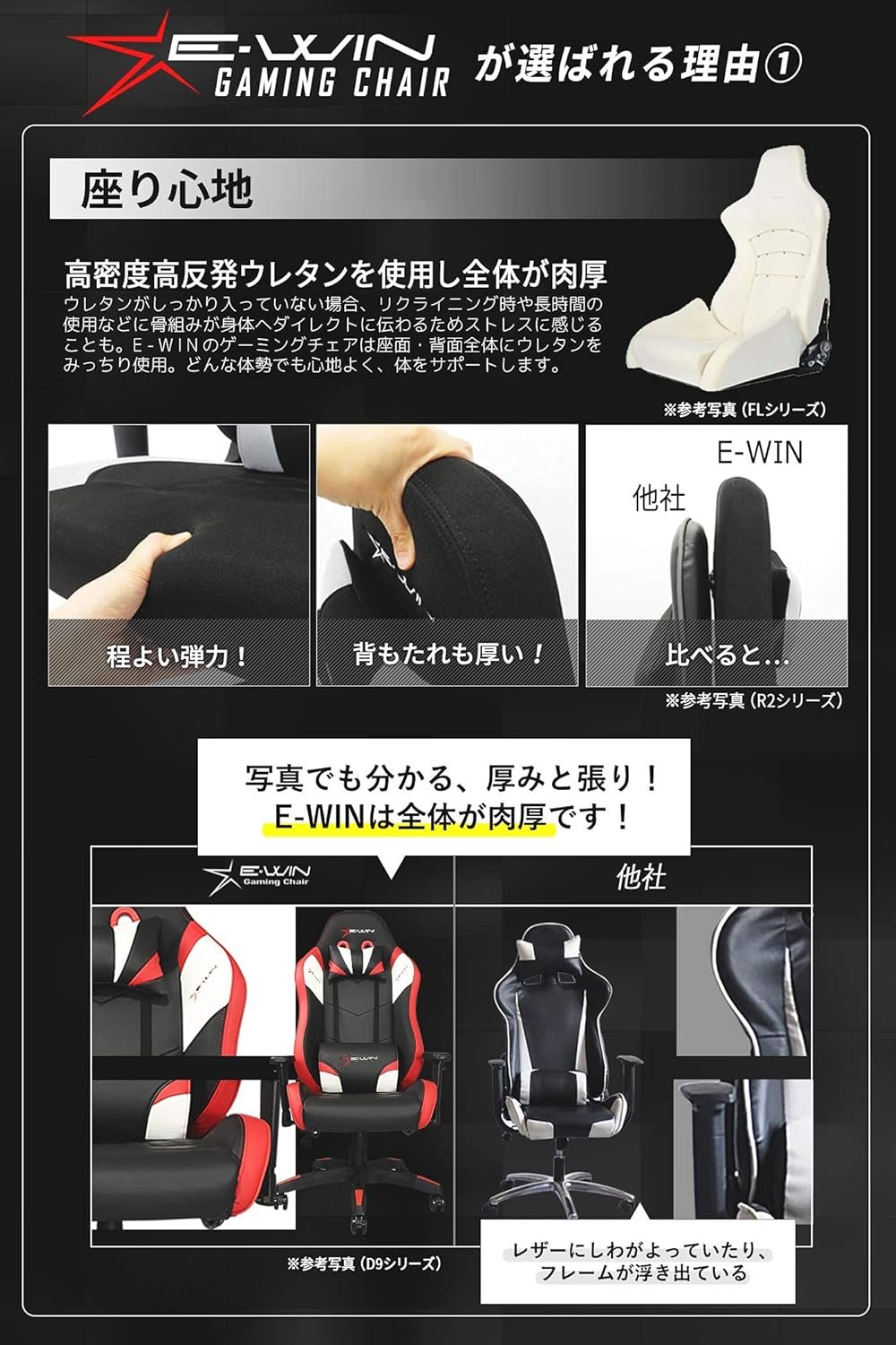 Standard type with basic functions as a gaming chair.E-WIN Gaming Chair is a unique high density and high resilience thick urethane that supports the entire body.