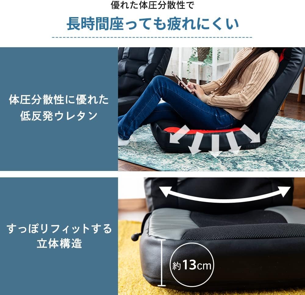 床に住んでいる人のための快適なゲームチェア。このゲームの椅子は、このアイデアから生まれました。座席は、長い間座っていても、体圧を分散させ、疲労を防ぐのに十分な厚さ5.1インチ(13 cm)です。下に感じずに快適です。さらに、ゲーム、テレワークなどに使用できます。さらに、平らにリクライニングできるため、使用していない場合はスリムなストレージに耐えることができます。