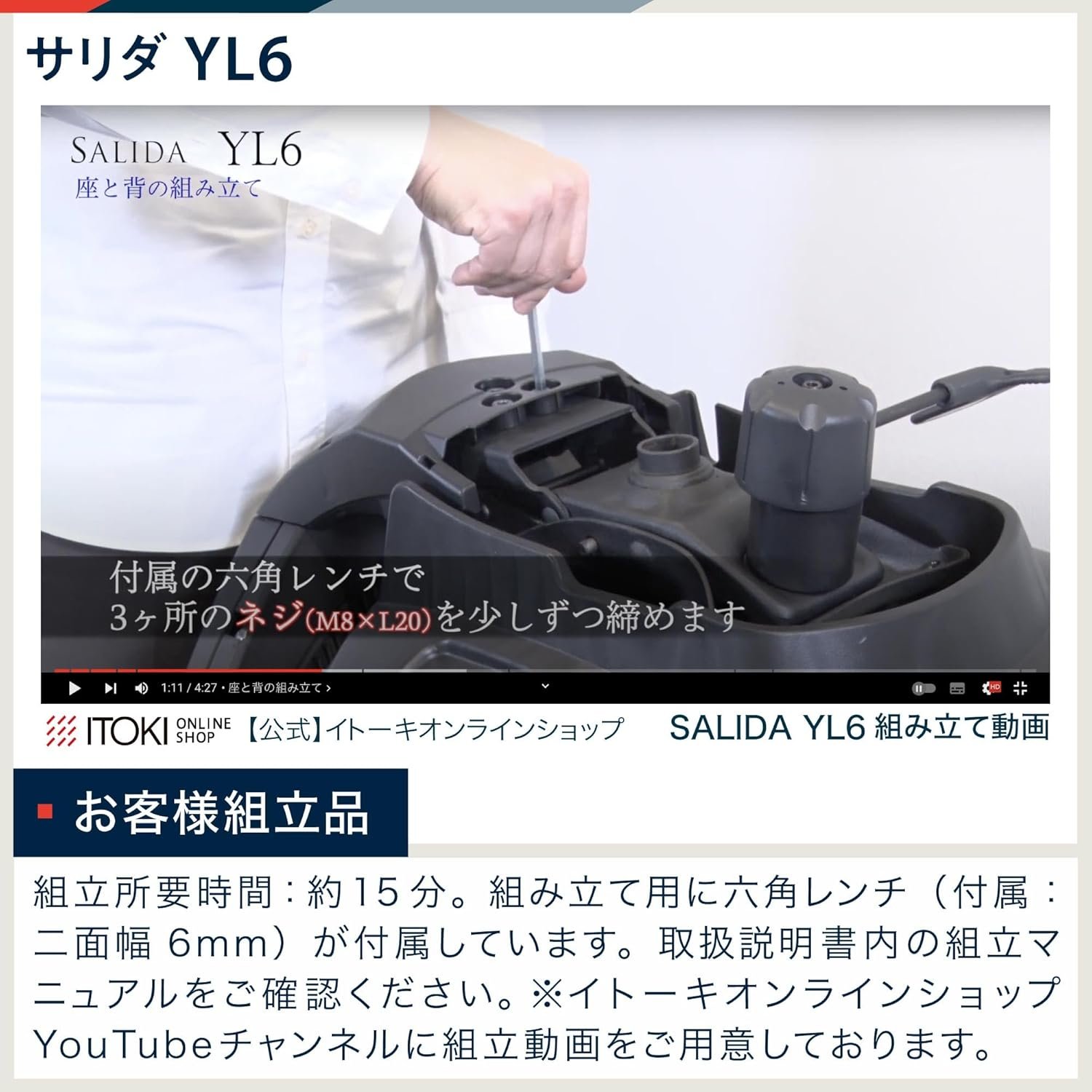 アセンブリが必要:アセンブリ時間:約15分。ヘックスレンチ(含まれる):2つの側面幅6mmアセンブリのためのアセンブリマニュアルを確認してください。アセンブリビデオはitokiオンラインショップYouTubeチャンネルで入手できます