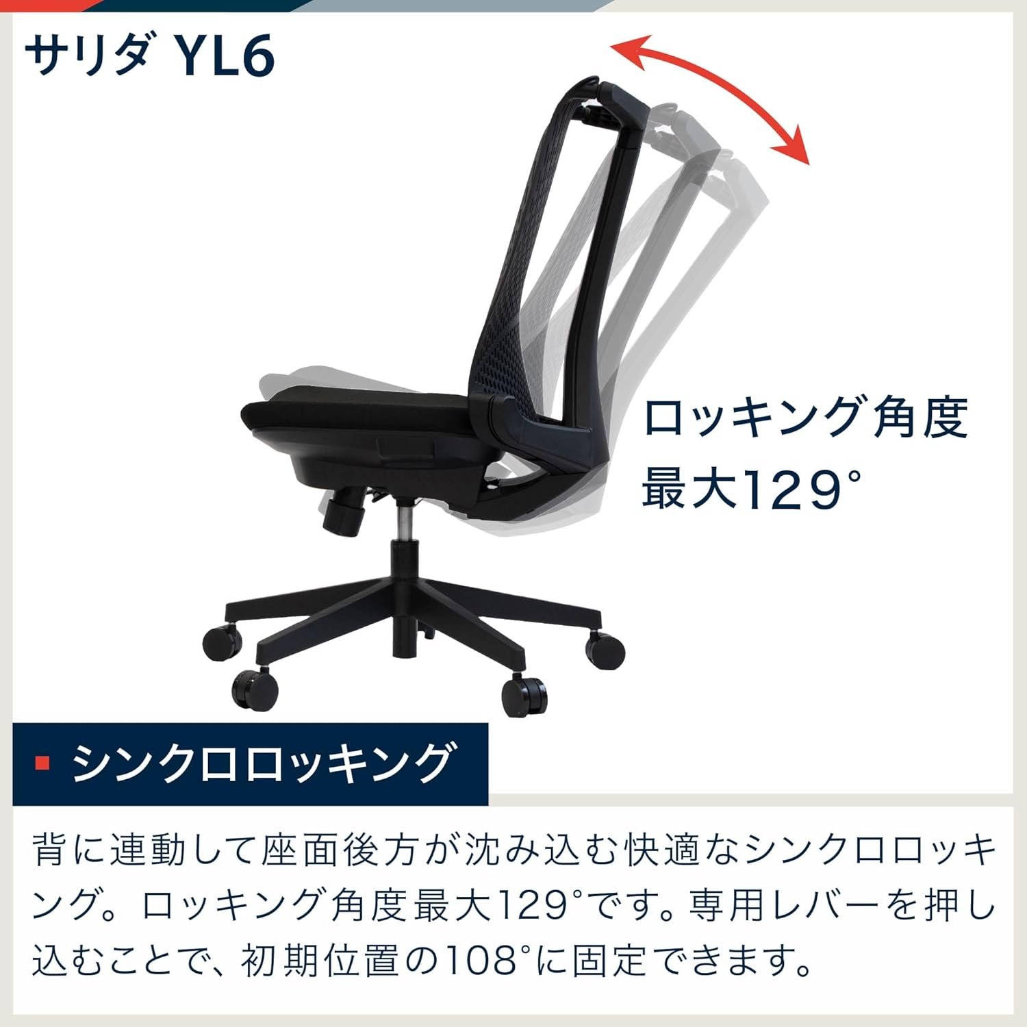 同期ロッキング:背中とともに動く快適な同期ロッキング。最大129°のロック角度。専用のレバーを押すと、108°の元の位置に固定できます。