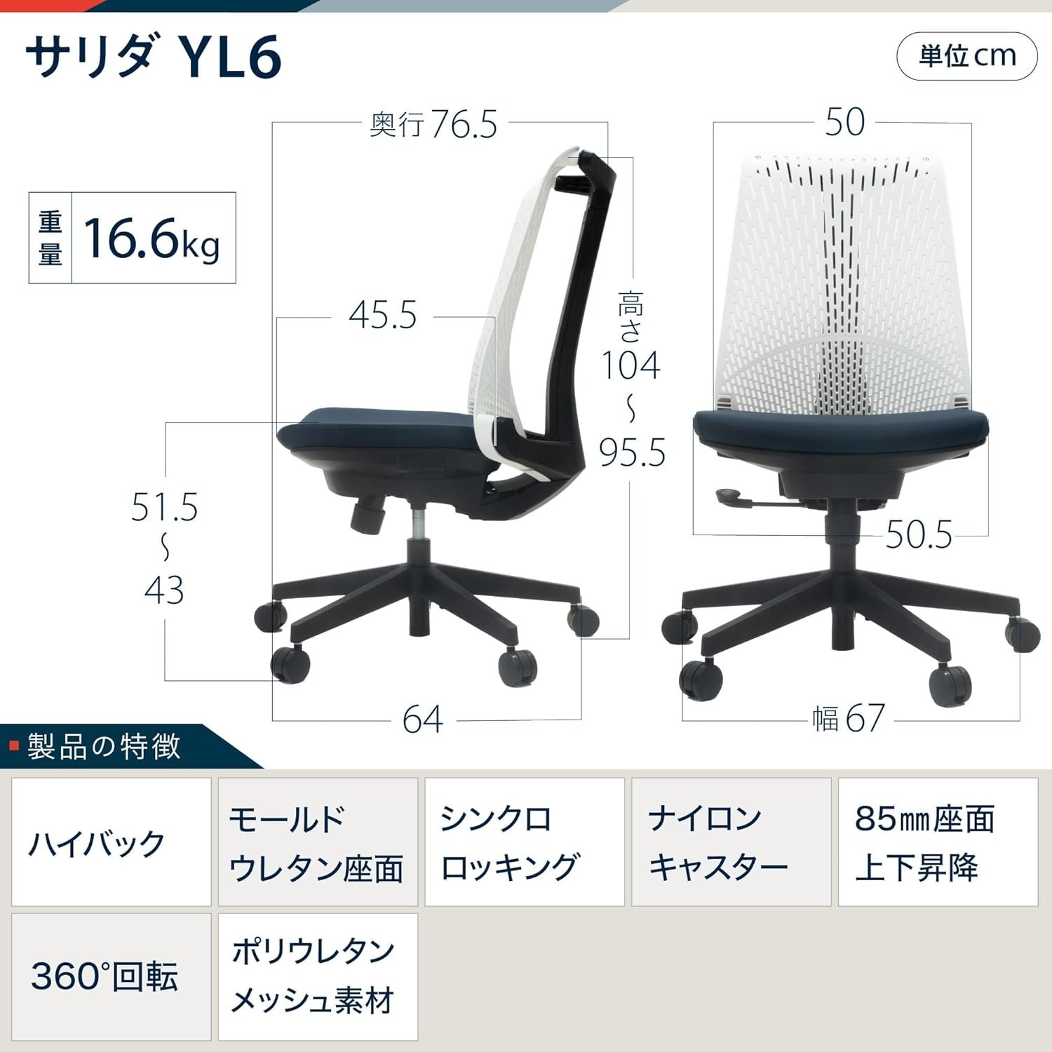 背中の高いサポート:背面は通気性のあるメッシュ型ポリプロピレン材料で作られています。クリーンバックデザインは、スペースにスタイルを追加します。