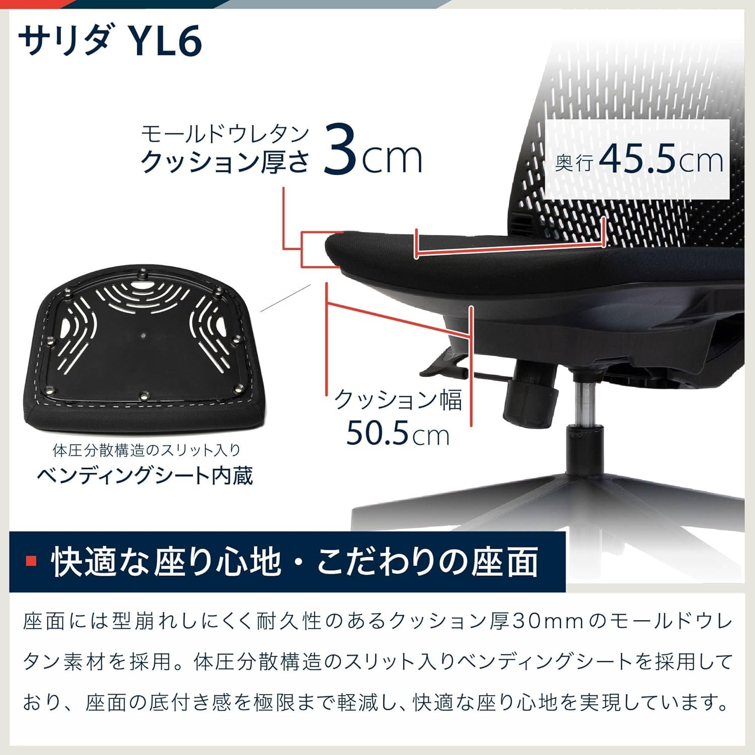 (快適な座り込み面)シートは、厚さ1.2インチ(30 mm)のクッションを持つ成形ウレタン材料で作られており、耐久性があり、その形状を失いません。体圧分散構造でスリットベンディングシートを採用し、シートの底の感覚を限界まで低下させ、快適な座り込み体験を提供します