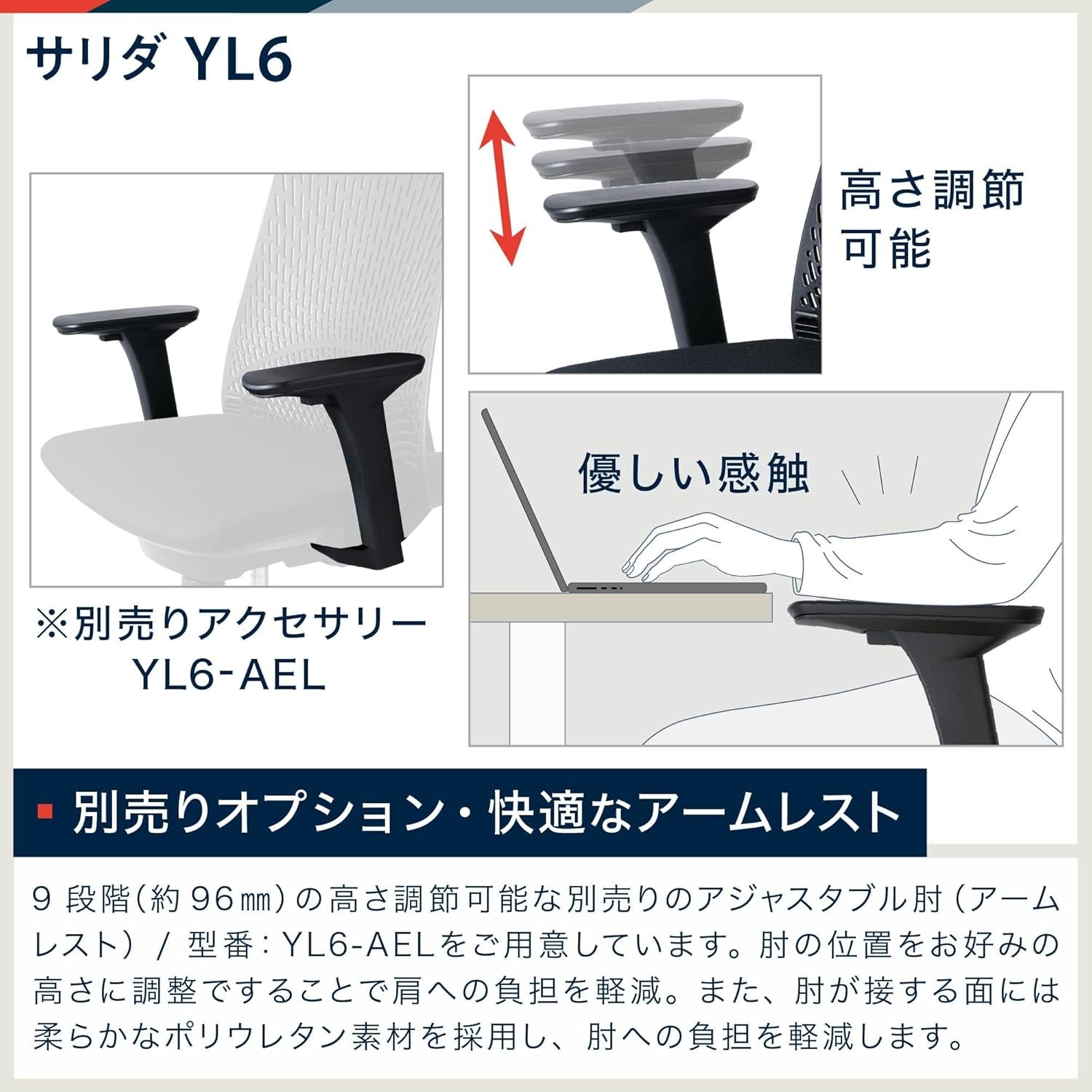 (Optional Optional and Comfortable Armrest) Comes with 9 adjustable elbows (armrests) with 9 levels (approximately 3.8 inches (96 mm)). Model Number: YL6-AEL available. Adjust the elbow position to your preferred height to reduce the burden on your shoulders. In addition, the part of the elbow is made of a soft polyurethane material that reduces the burden on the elbow.