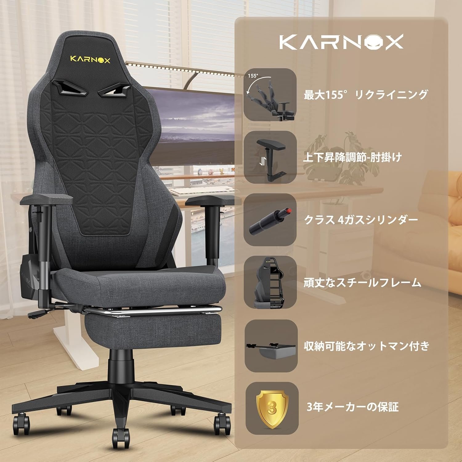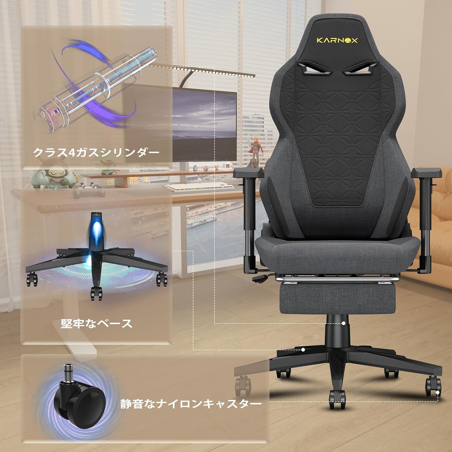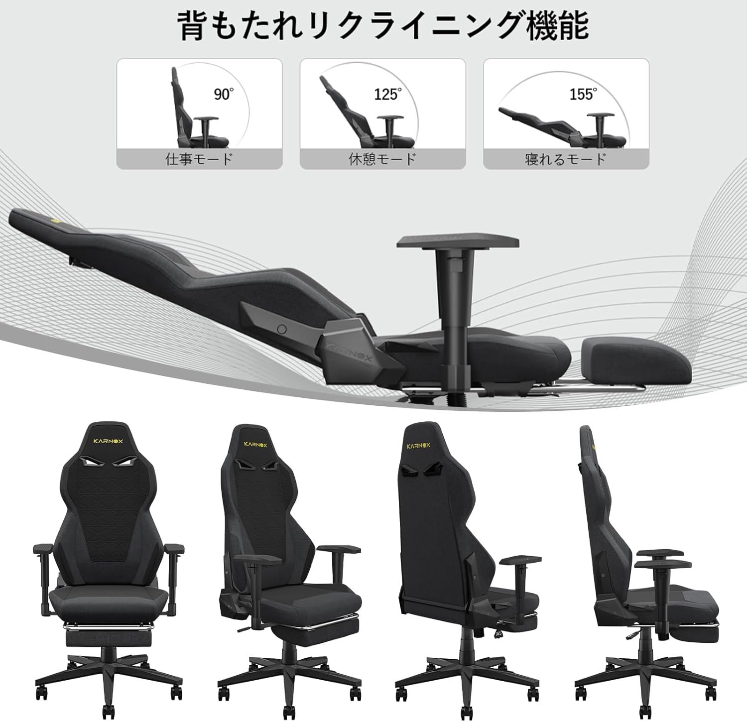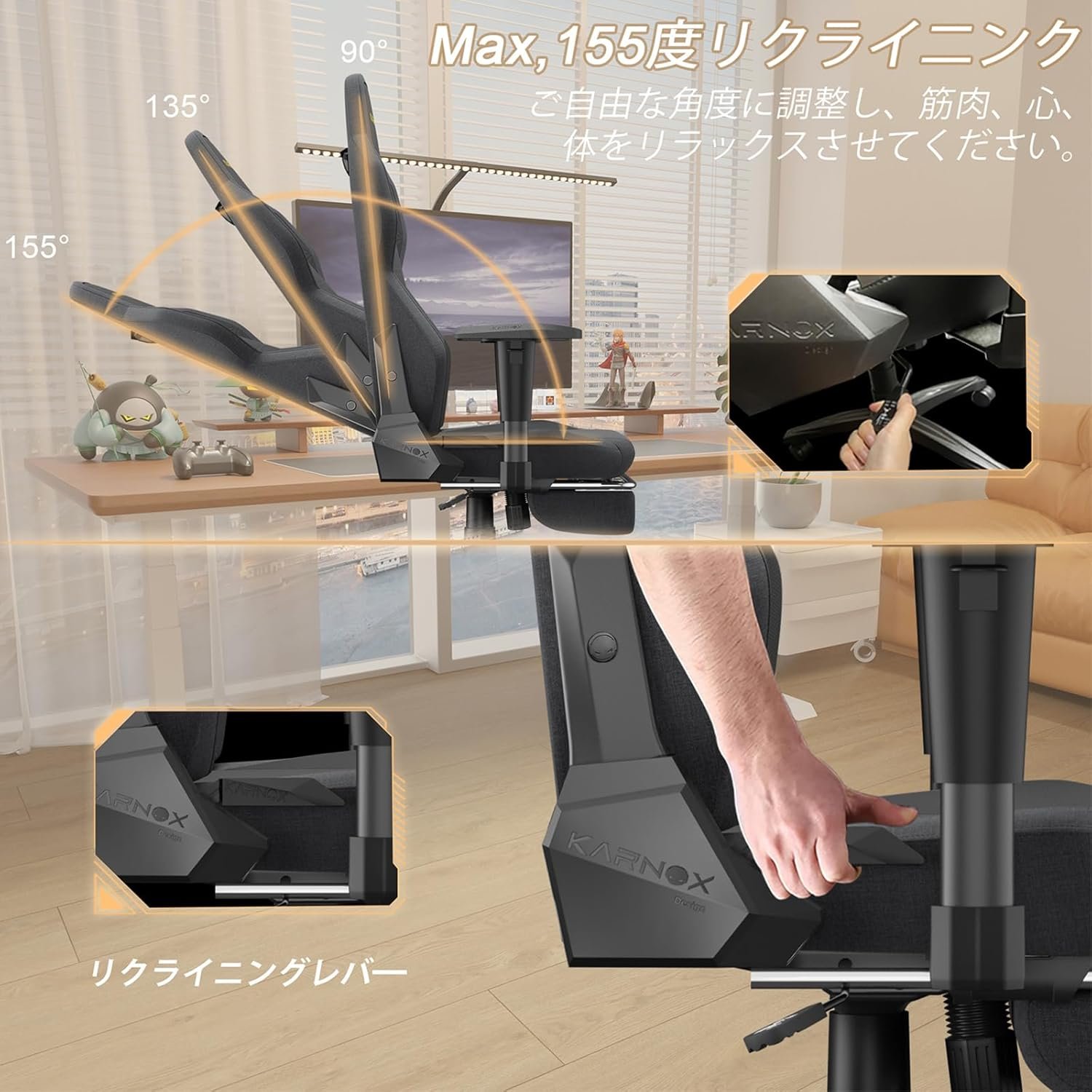 Karnoxゲームチェア、PCチェア、ハイバック、調整可能な背もたれ、人間工学に基づいたデザイン、90-155度リクライニング機能、三角ホールゲームチェア、ファブリック、グレー&ブラック