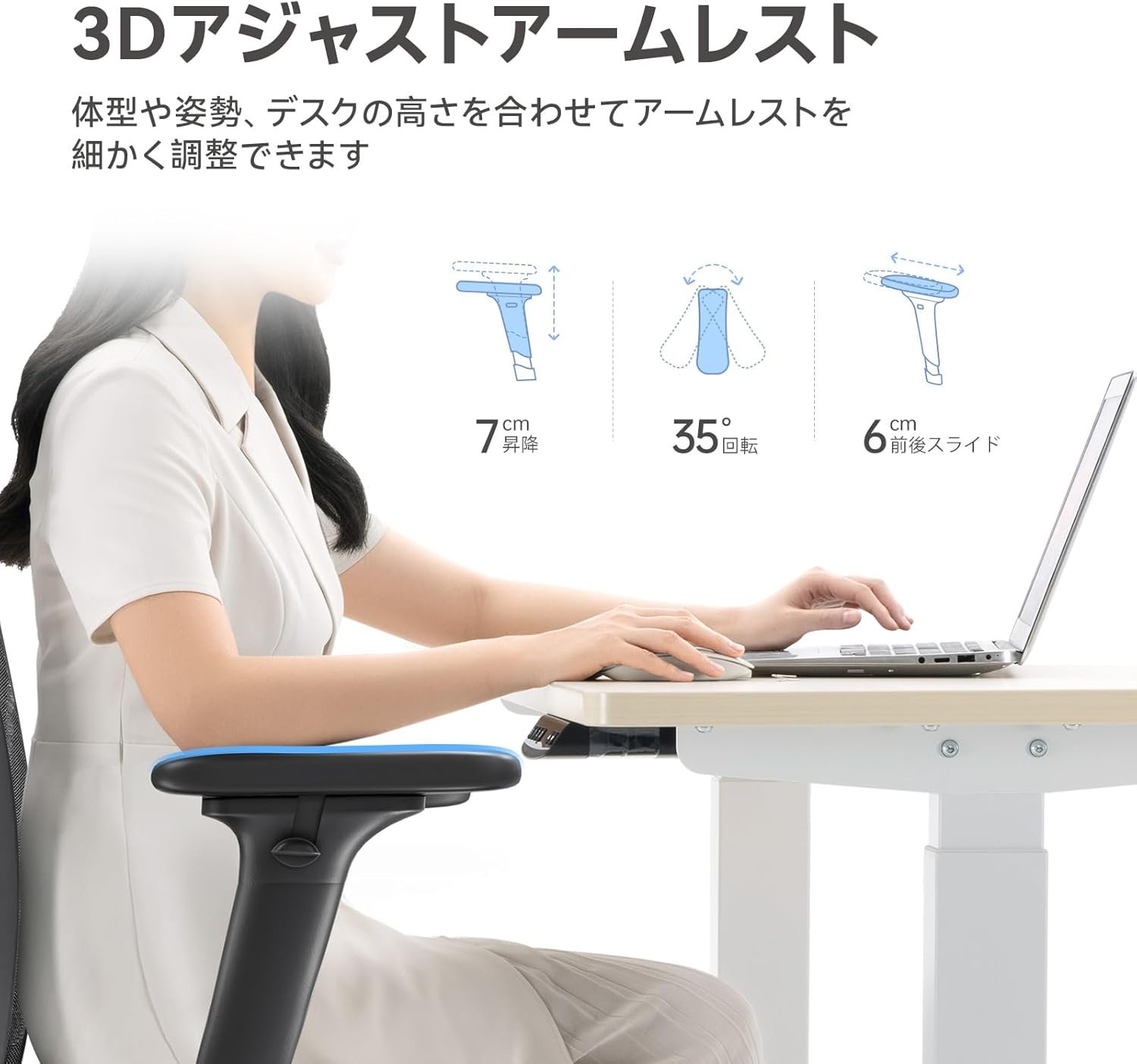 2Dヘッドレストと3Dアームレスト:このメッシュチェアは、2Dヘッドレストを使用しています。上下に3.5インチ(9 cm)に調整でき、45°の角度に調整できます。頭と首を完全にサポートできます。デスクチェアには3Dアームレストが装備されており、標高2.8インチ(7 cm)、回転35°、2.4インチ(6 cm)のスライドが可能になります。あなたの体の形、姿勢、机の高さに合うように、アームレストを微調整します。机で長時間働く人に最適