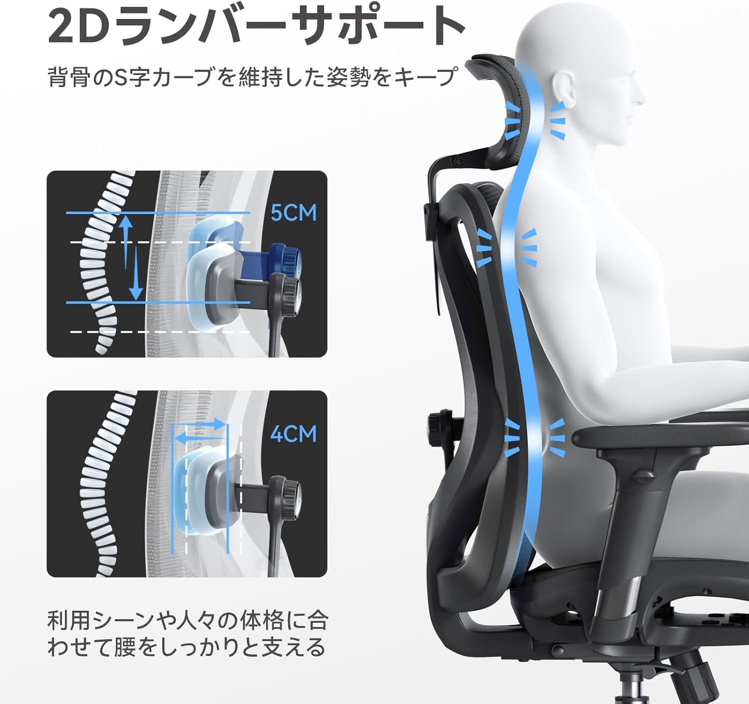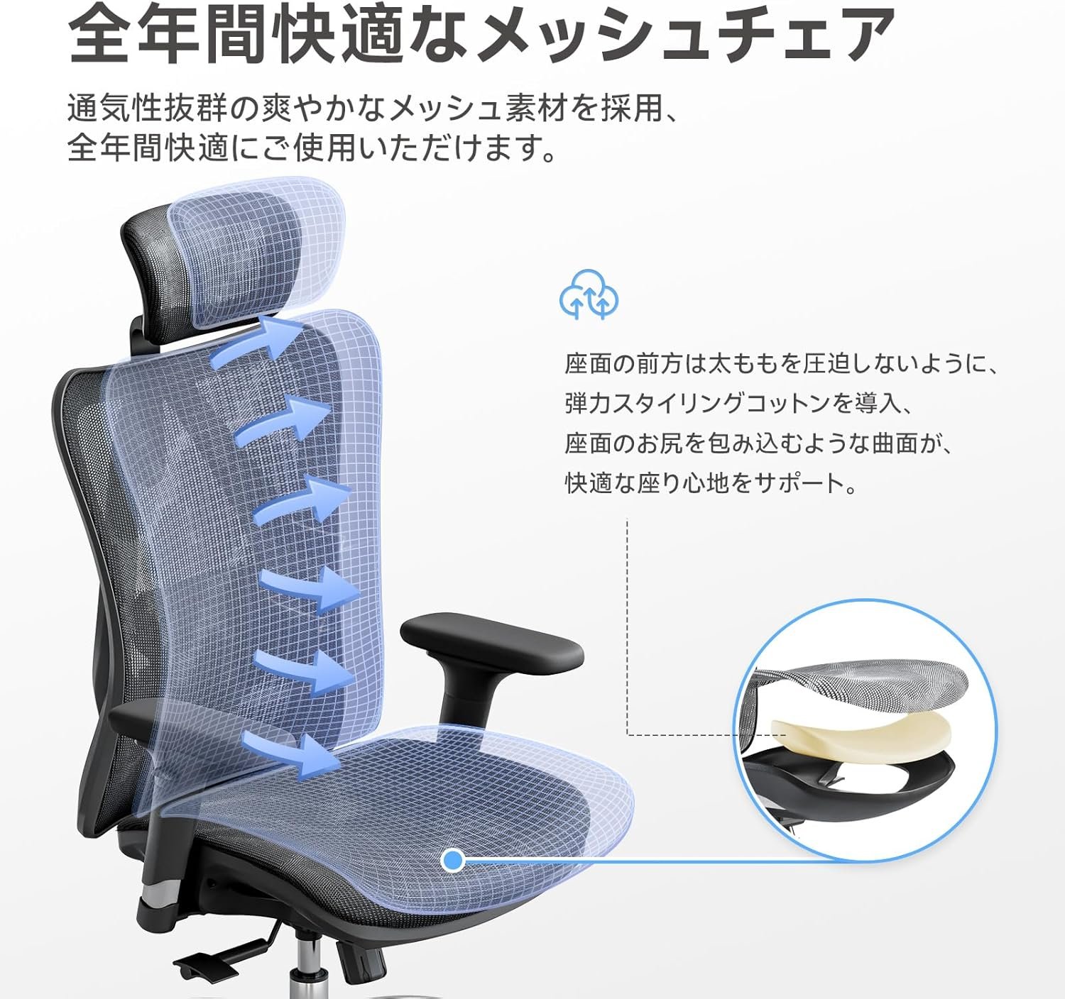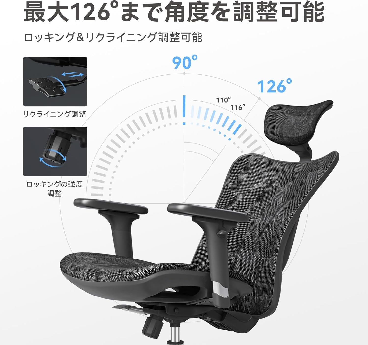 Sihoo M57メッシュチェア、オフィスチェア、人間工学に基づいた椅子、疲労なし、デスクチェア、S字型の背もたれ、3Dアームレスト、可動腰椎サポート、126°リクライニング、2Dヘッドレスト、PCチェア、メッシュチェア、コンピューターチェア、