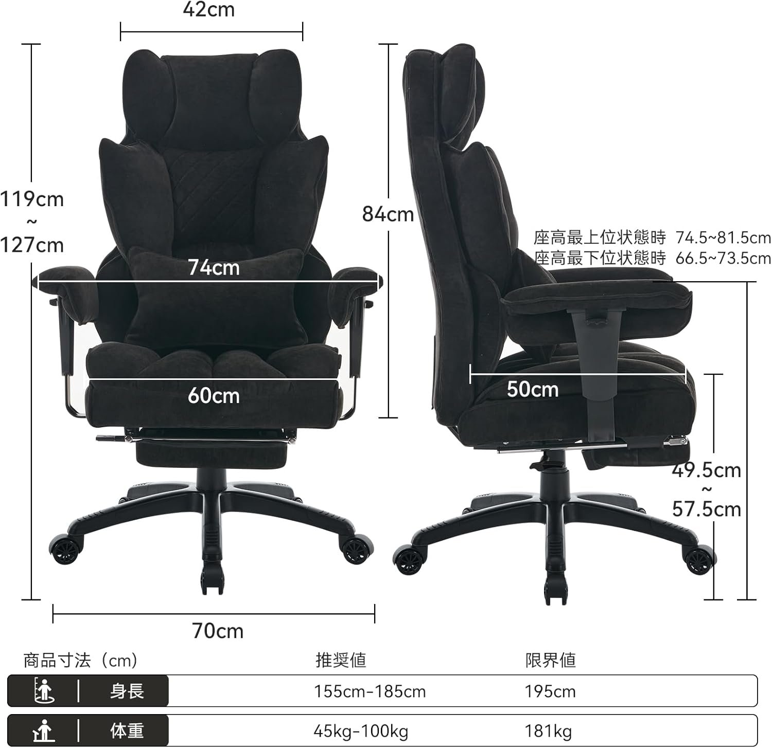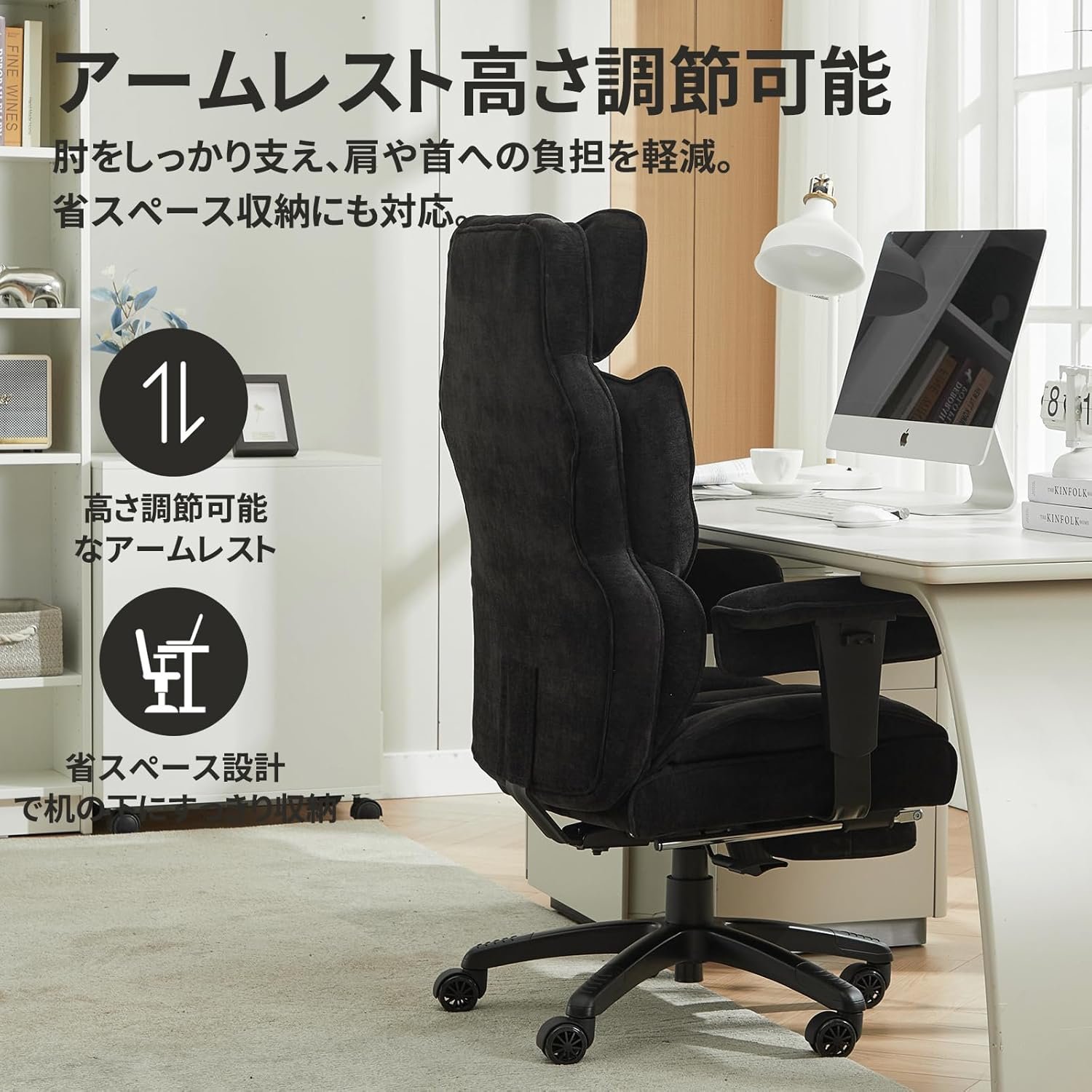 多機能人間工学に基づいたオフィスチェア:この大きなゲームチェアには、90°から135°、高さ8cmの調整、360°回転機能に調整できるリクライニング機能があります。さらに、新しく改善された高架アームレストは、以前のモデルよりも多くの可動域を提供し、腕と肩をよりよくサポートします。長時間の仕事やゲームの間に緊張を軽減し、より快適な座り込み体験を提供します