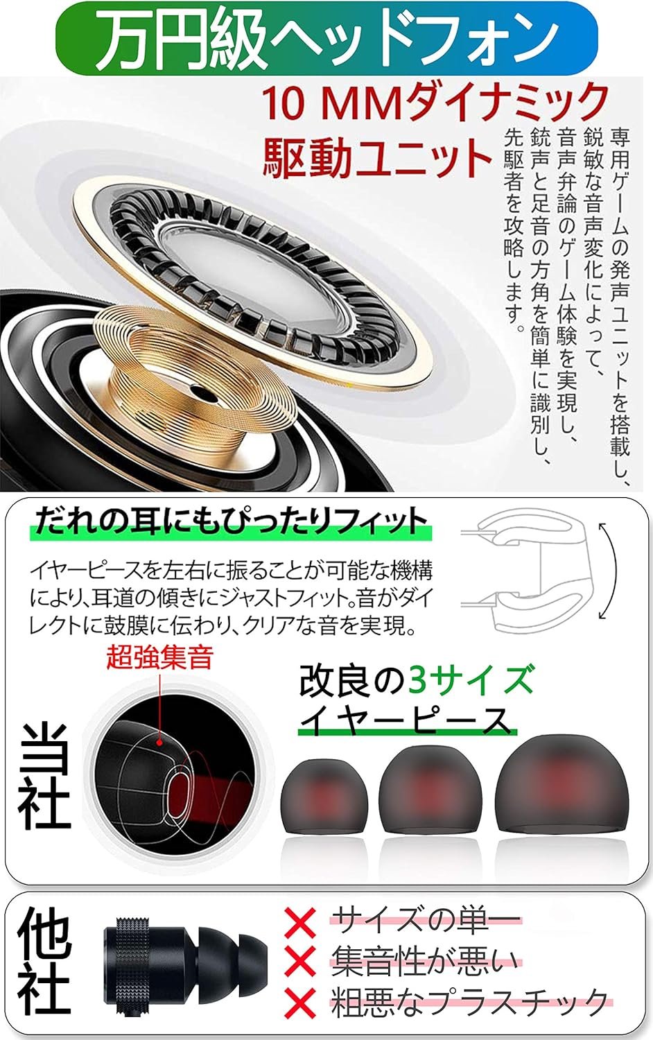 Kasott Soundmaster Pro V1 Gaming Earphoneは、高い音質と強力なベース再生を提供する10mmのダイナミックスピーカーを備えています。