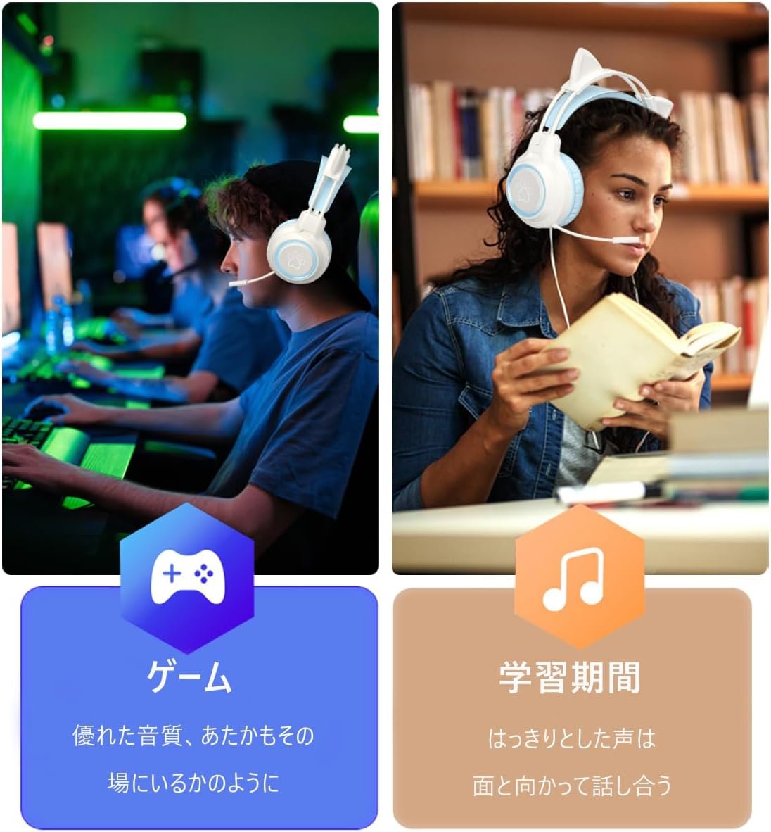 猫の耳のデザイン、LEDライト、360°の全方向ノイズキャンセルマイク。