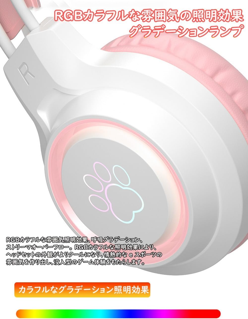 猫の耳のデザイン/LEDライト:グラデーションの色と猫の耳と明るいLEDライトの組み合わせは、非常に素晴らしく、ファッショナブルであり、最近注目を集めています。猫の耳は取り外し可能なデザインであり、子供、友人、コスプレファンにとって素晴らしいクリスマスプレゼントです。 RGBカラフルな雰囲気のグラデーションランプRGBカラフルな雰囲気の照明効果、呼吸グラデーション、ストリーマーオーバーフローRGBカラフルな照明効果により、ヘッドセットが涼しく見えるようになり、情熱的な電子スポーツの雰囲気を作り、没入型のゲーム体験をもたらします。 LEDライトは、ゲーム時に雰囲気を即座に強化します。きらめく、とてもかわいい。それはあなたの機動性を高めます