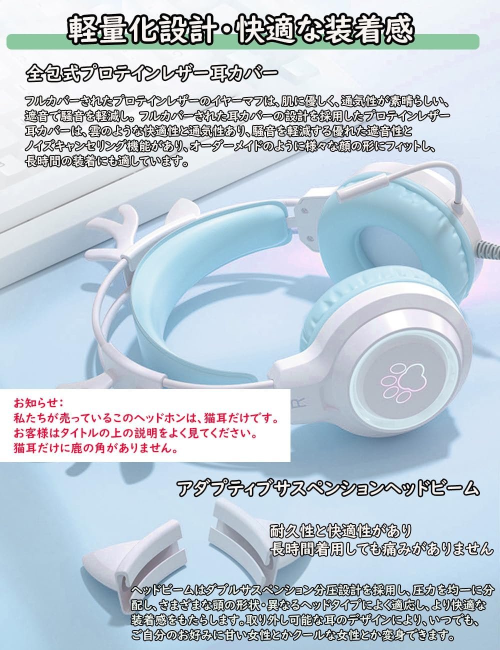 軽量のデザインと快適な摩耗:完全に密閉されたプロテインレザーの耳カバー:完全に覆われたプロテインレザーのイヤマは、優れた通気性とノイズの分離を備えた肌に穏やかです。タンパク質レザーの耳カバーフルカバー耳カバーデザイン、クラウドのような快適さと通気性、優れたノイズ分離とノイズキャンセル機能を備えたノイズを減らし、長時間着用するのに適したカスタムのようなさまざまな顔の形を適合させます。適応型サスペンションヘッドビーム:ヘッドビームは、圧力を均等に分配し、さまざまなヘッドシェイプとさまざまなヘッドタイプに適応し、より快適なフィット感を提供するダブルサスペンションうつ病設計を採用します。取り外し可能な耳のデザインにより、お気に入りの甘い女性やクールな女性をいつでも変えることができます