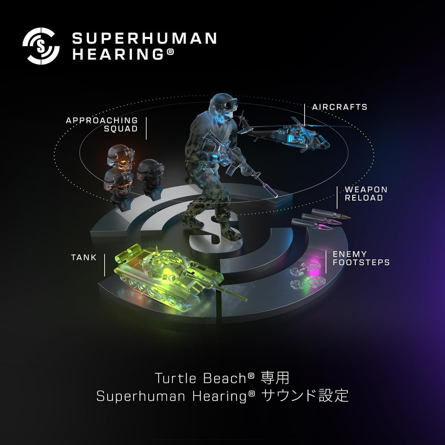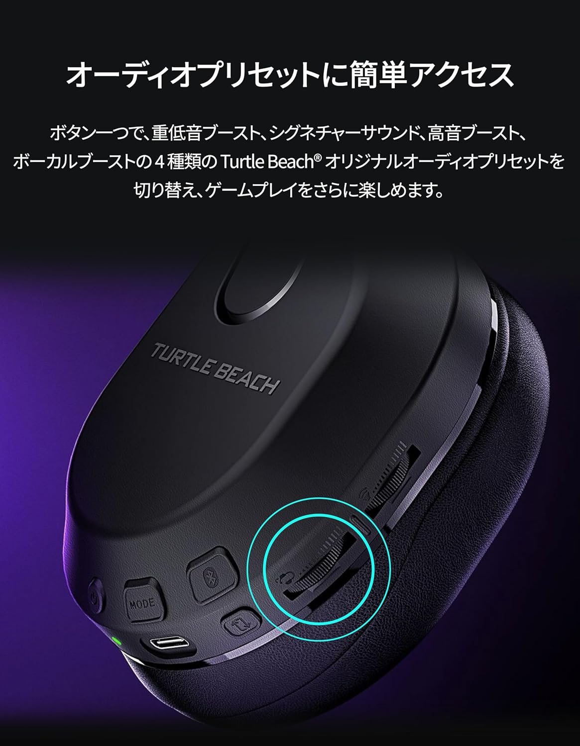 1つのボタンを使用すると、ディープベースブースト、シグネチャーサウンド、トレブルブースト、ボーカルブーストなど、4つのオリジナルのタートルビーチオーディオプリセットを切り替えることができます。 - Advanced SuperhumanHearing®