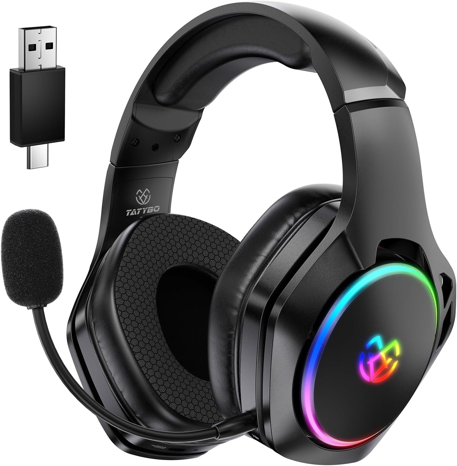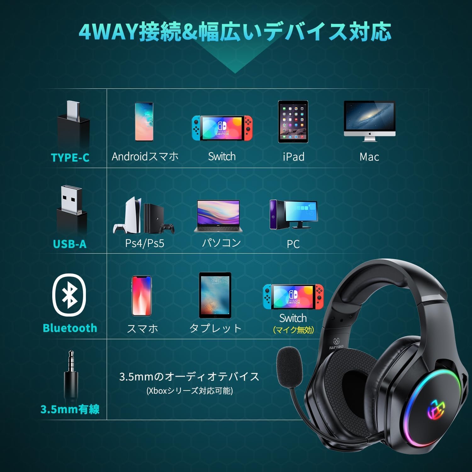 Tatybo Gaming Headset、ゲームヘッドセット、PS5、PS4、ヘッドセット、Bluetoothヘッドセット、マイクが含まれています、タイプC&USBワイヤレスレシーバー、Bluetooth/0.1インチ(3.5 mm)有線、3方向の接続、ENCノイズ