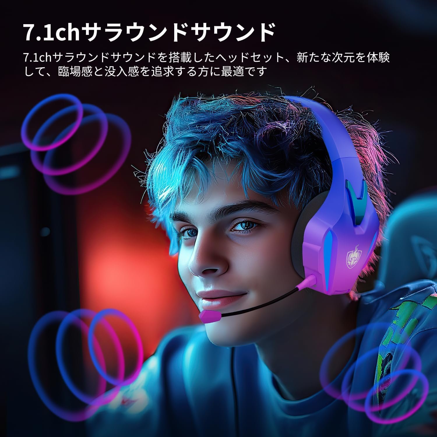 YOTMSゲームヘッドセット、PS5ヘッドセット、ヘッドセット、有線ワイヤレス、デュアル使用、低レイテンシ、USB2.4GHz 7.1、サウンドエフェクト、ワイヤレスヘッドフォン、LEDライト、低レイテンシ、ノイズコントロール、ディープベース、シールタイプ、ヘビーベース、コントローラーミュート、ブルーパープル