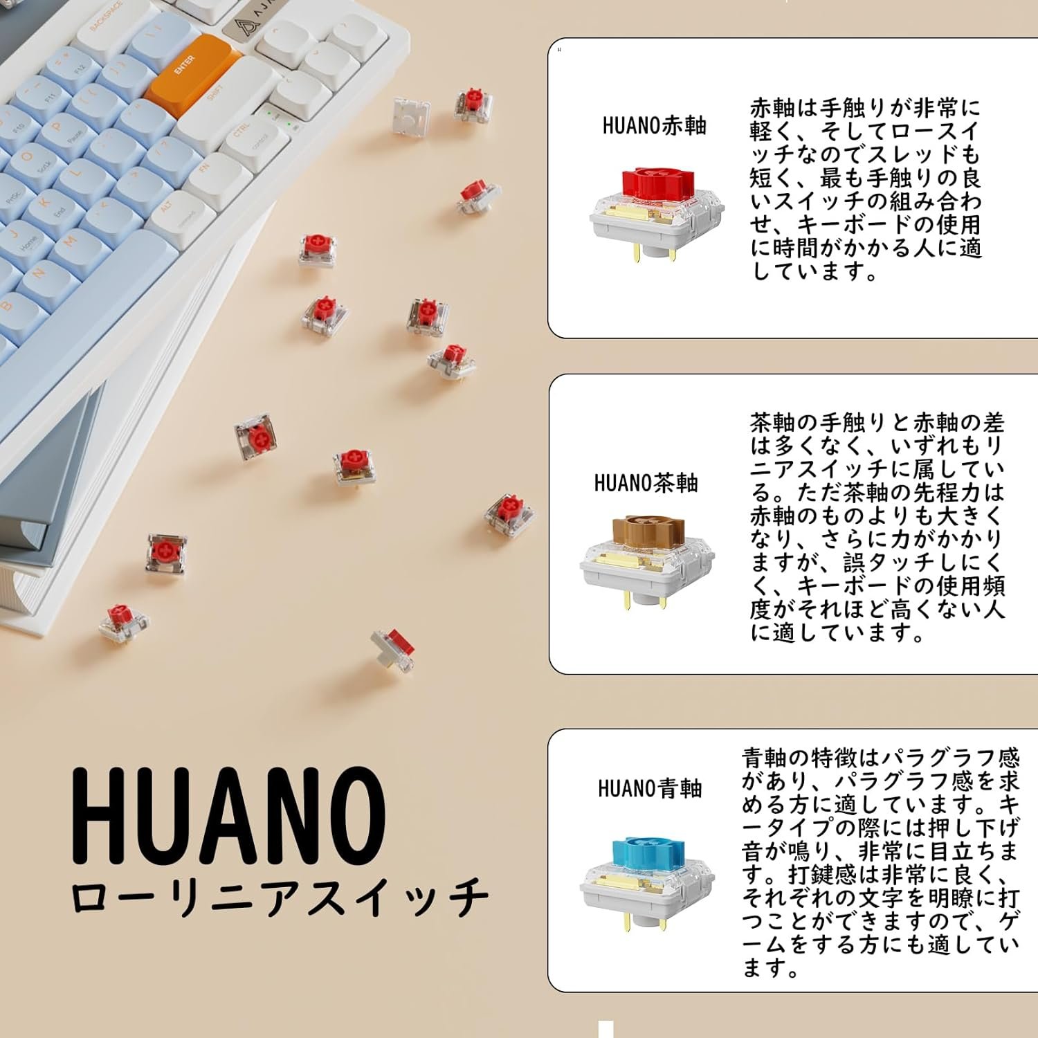 短距離 Rokey スイッチ: 軽量のワイヤレス キーボードは綿のような感触で、夢中になれる素晴らしい打感を持っています。このワイヤレスメカニカルキーボードはHUANOローキースイッチを採用しており、ロースイッチは通常のスイッチより短いため、キーへの電力が少なく、頻繁にキーを押すことによる疲労が軽減されます。コンピューター作業者に最適なゲーミングキーボード。 (ワイヤレスキーボード本体は一律でホットスワップ対応ではありません。)