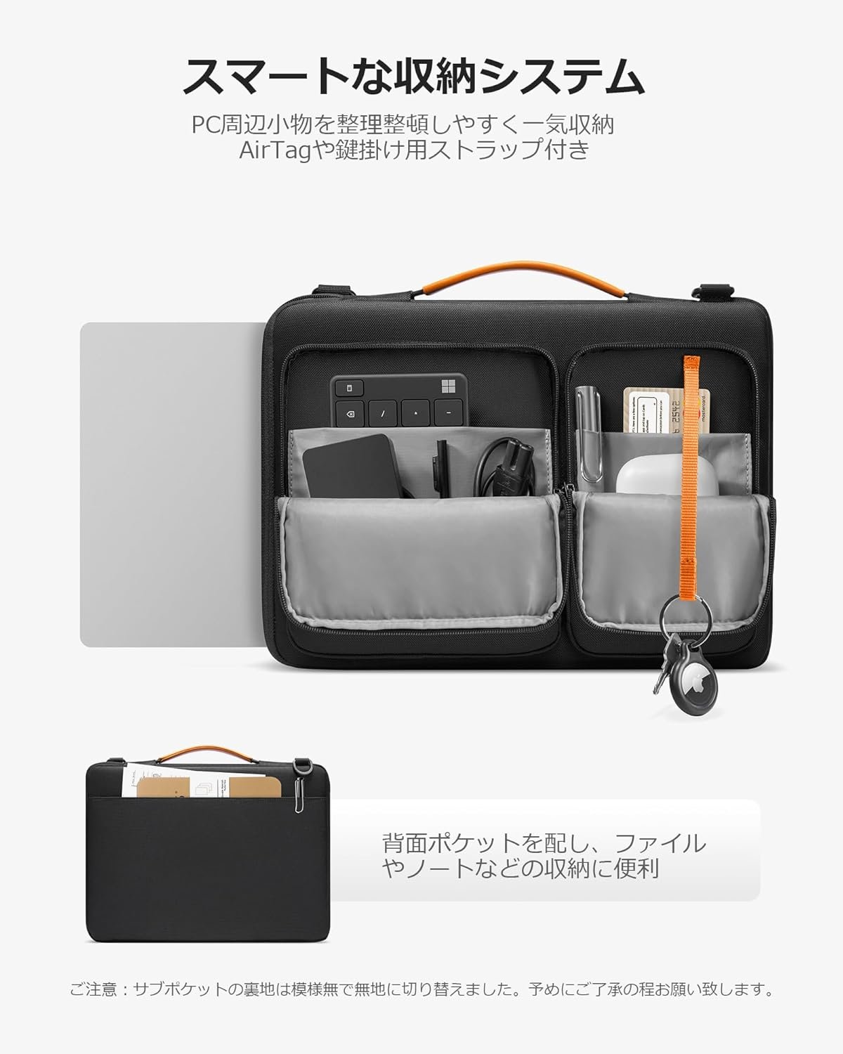 スマート3ルームサブストレージ:このラップトップケースには、2つの大きなフロントポケットと多くの小さなポケットとエアタグ/キーストラップがあります。パワー、ケーブル、ハブ、Kindleなどのガジェットをきちんと保存します。さらに、背面にも大きなポケットがあり、頻繁にアクセス可能なドキュメントやその他のアイテムを保存するのに最適です。
