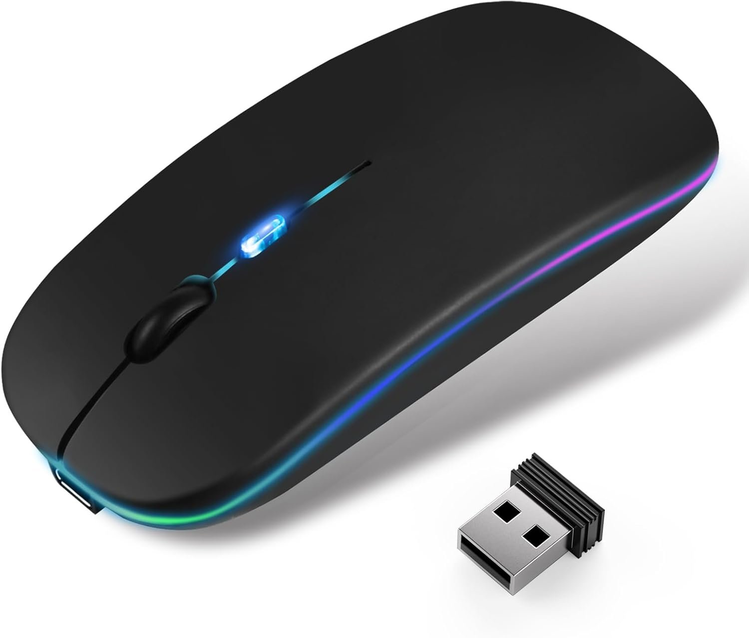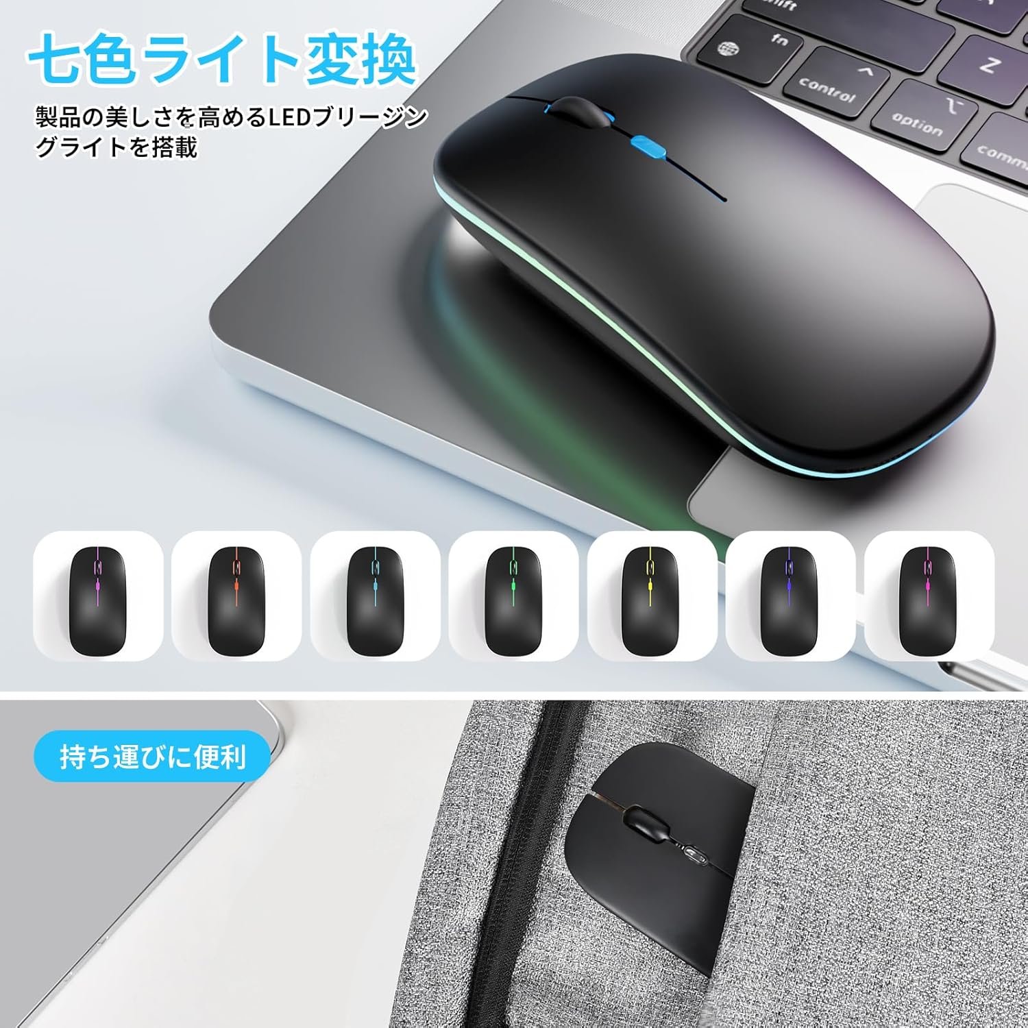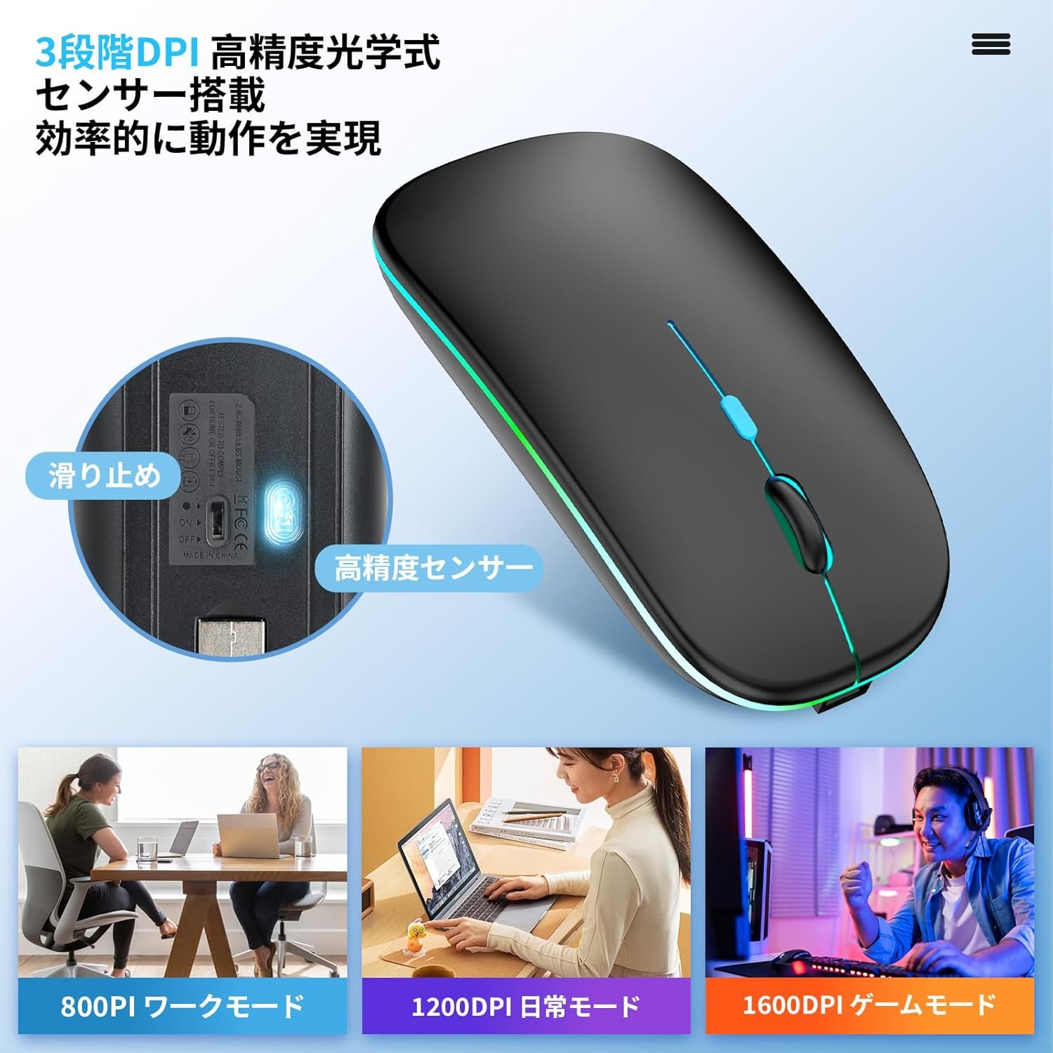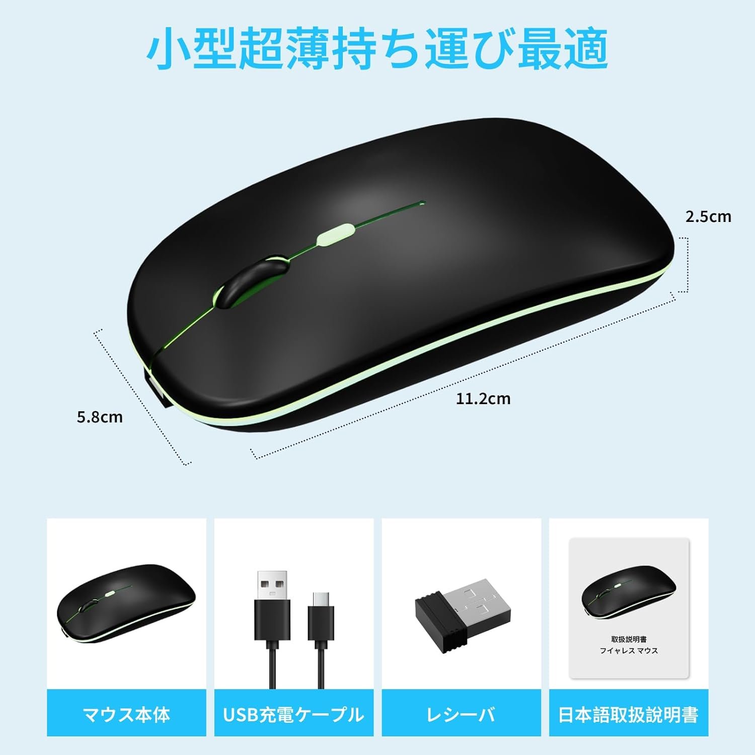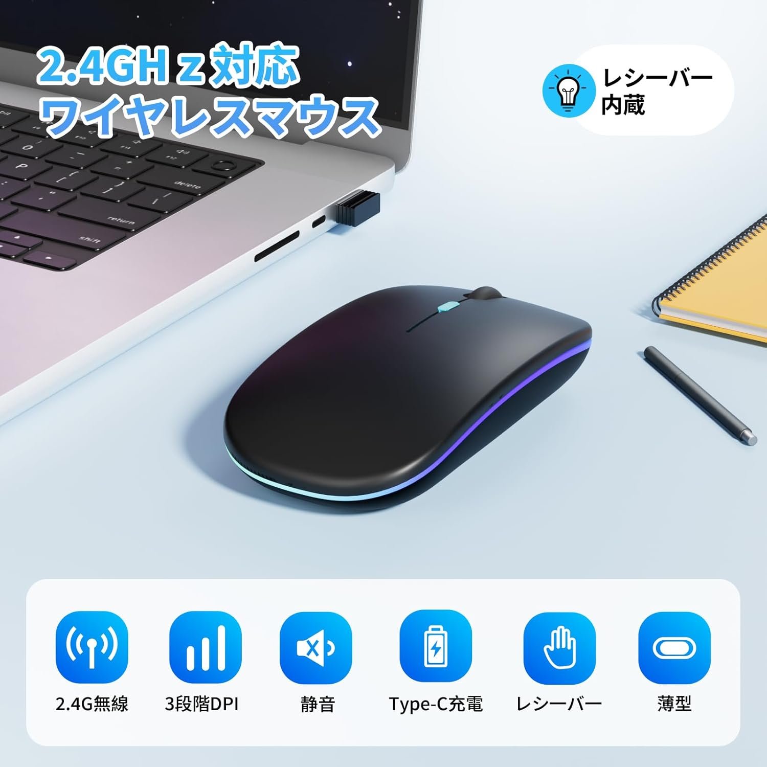 ワイヤレスマウス、ウルトラヒン&タイプC充電式、サイレント3DPIモード、2.4 GHz、7カラーライト、光学、高精度、発電モデル、ポータブル、イージー接続、小、耐久性、PCと互換性のある、