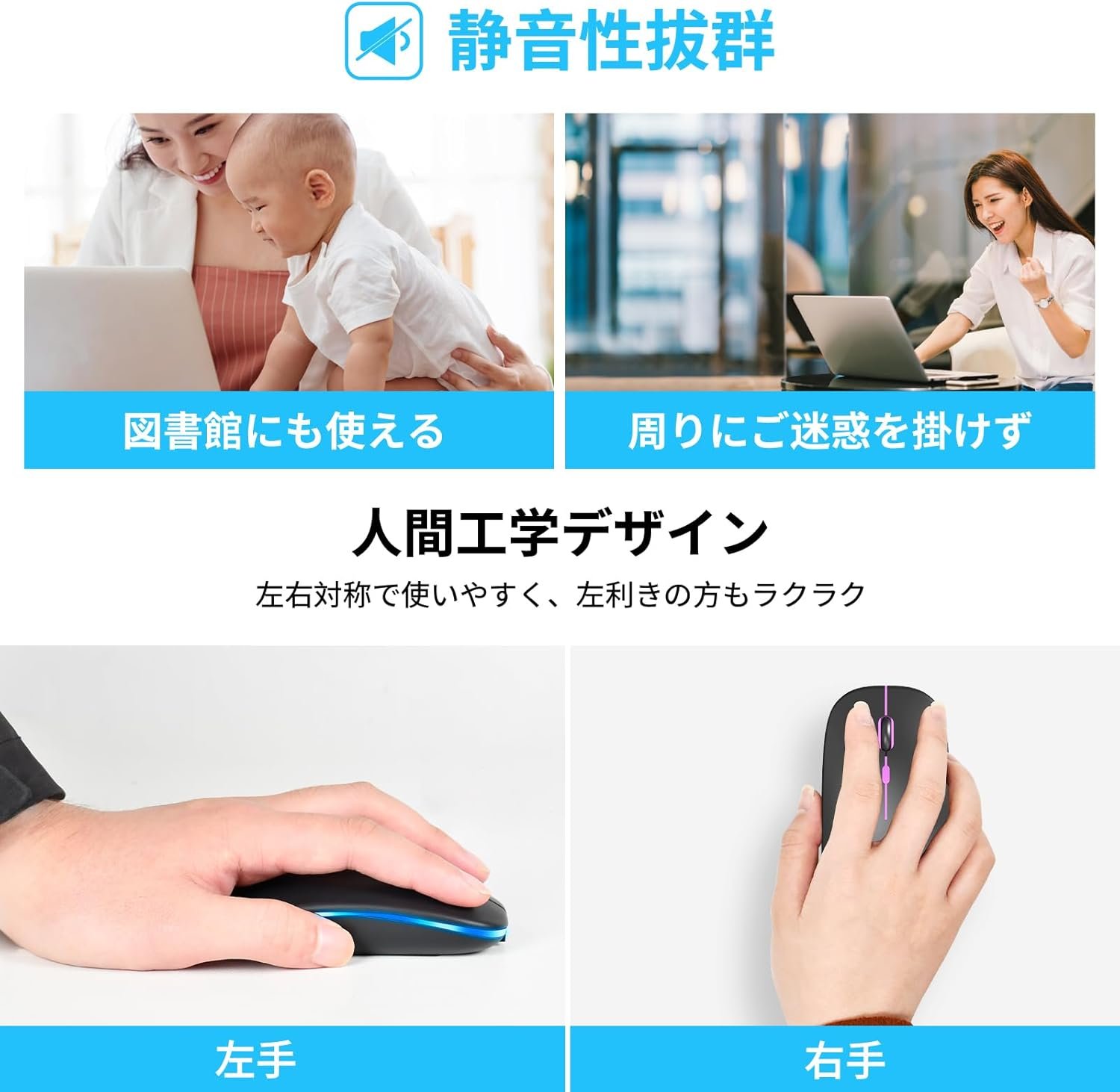 人間工学に基づいたデザインと持ち運びが簡単】このワイヤレスマウスの形状は自然に手にぴったり合っており、人間工学に基づいて設計されています。手のひらにフィットし、長期間使用した後でもスムーズな体験を提供しますが、疲れません。薄いワイヤレスマウスには軽量の機能があるため、バッグに入れたときにその存在をほとんど感じることができません。低プロファイルマウスの薄いデザインはあまりスペースを占有しないため、持ち運びと保管に非常に便利です