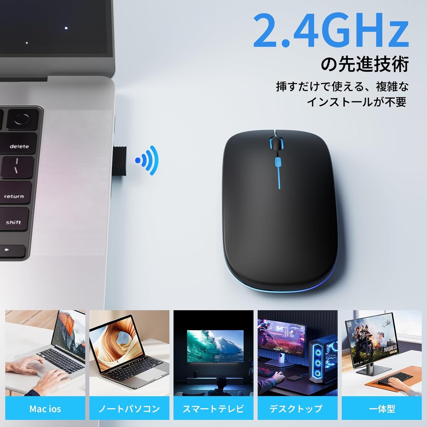 (2.4 GHz互換&簡単な接続)充電式マウスは、安定した接続、正確なスキャン、および高速データ転送を可能にする成熟した2.4 GHz接続テクノロジーを使用します。最大動作距離は32.8フィート(10 m)です。複雑な接続手順を必要とせずにコンピューターに簡単かつ迅速に接続し、付属のコネクタをコンピューターのUSBポートに差し込み、接続を完了します。作業をより効率的にするワイヤレスマウス