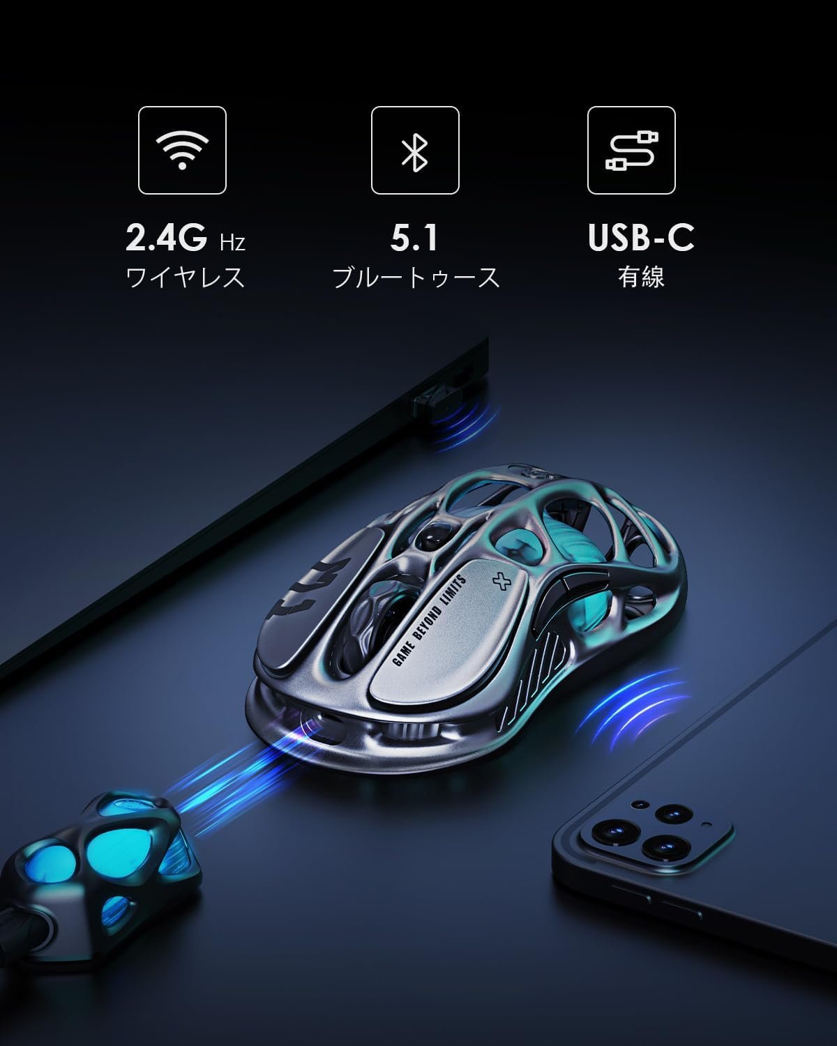 (2.4GHz、Bluetooth 5.1 Wireless、Type-C Wiredをサポート):スムーズな切り替えのための3つの接続モード。ゲームを簡単にプレイします!どの接続モードが接続されていても、ケーブルに接続すると自動的に有線モードに切り替わります。 luminous luminous RGB】5ライトモード。ドライバーソフトウェアを使用すると、ドライバーでライトを調整してオン/オフにすることができます