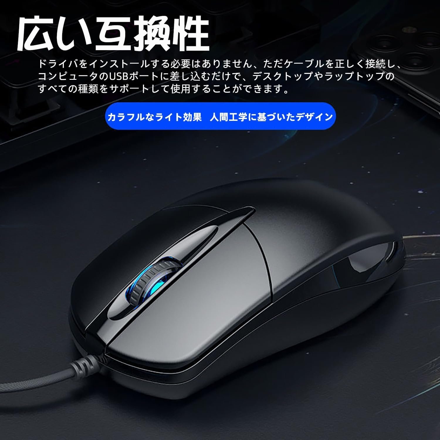 人間工学に基づいたデザインと光効果:シンプルでコンパクトなプロファイル、洗練されたモダンなデザイン。あなたの手にフィットし、使いやすいと感じるように人間工学に基づいて設計されています。スクロールホイールにはカラフルな光効果があります
