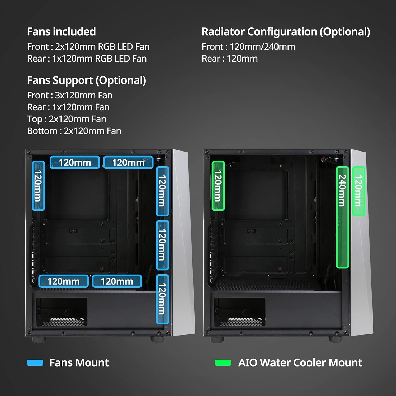 ファンを含む:フロント:4.7インチ(120 mm)RGB LEDファンx 2、バック:4.7インチ(120 mm)RGB LEDファンX 1