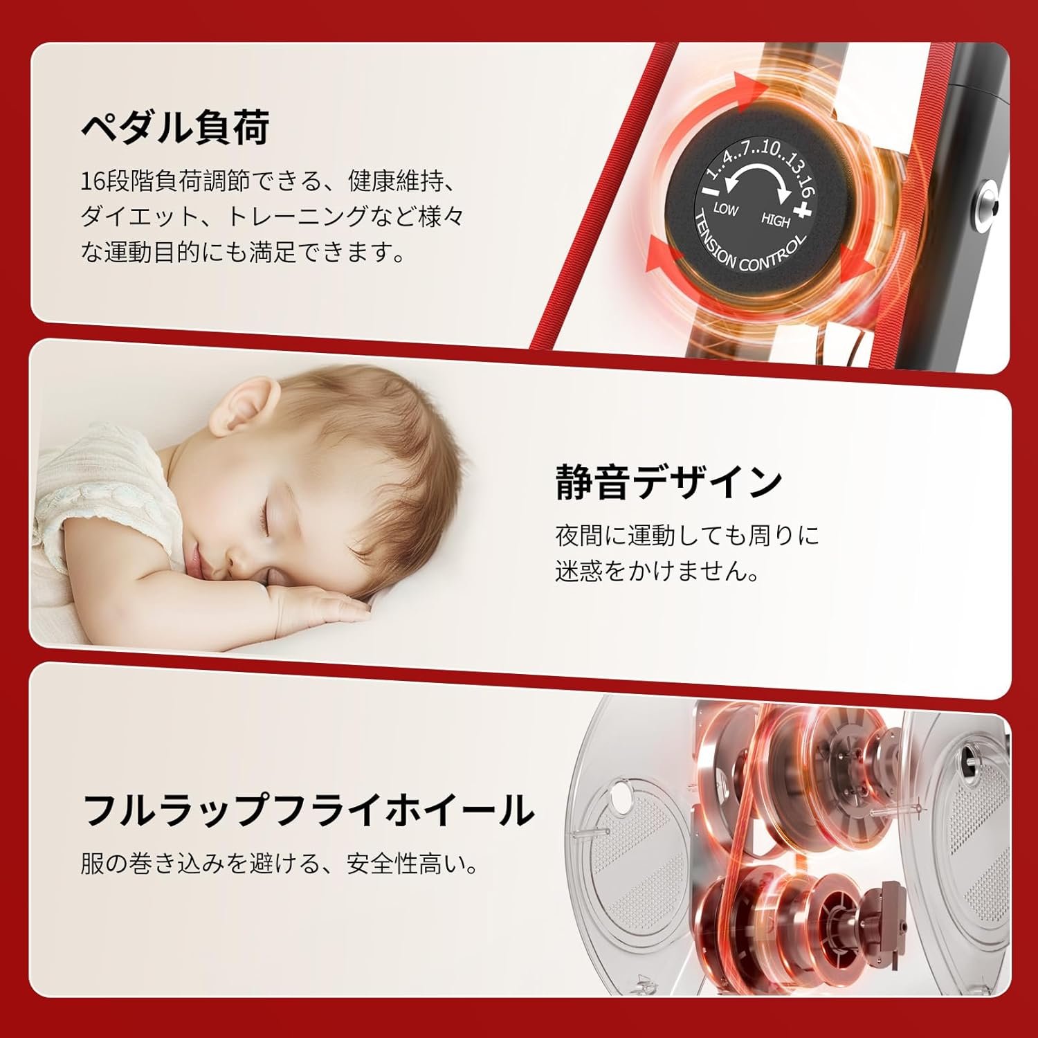 ワークアウトの安全性保護▶フルラップフライホイール、衣服に巻き込まれないようにしてください。高い弾性サドル、お尻をサポートし、痛みが長い間使用されないようにします。運動中に足が滑るのを防ぎ、運動の安全を保護するためのペダルストラップが付属しています