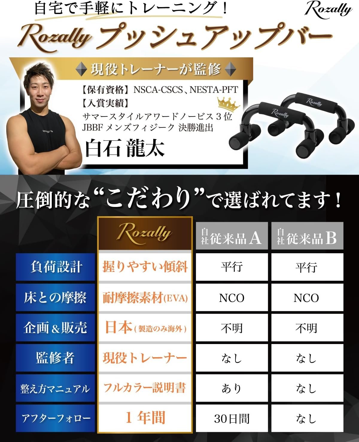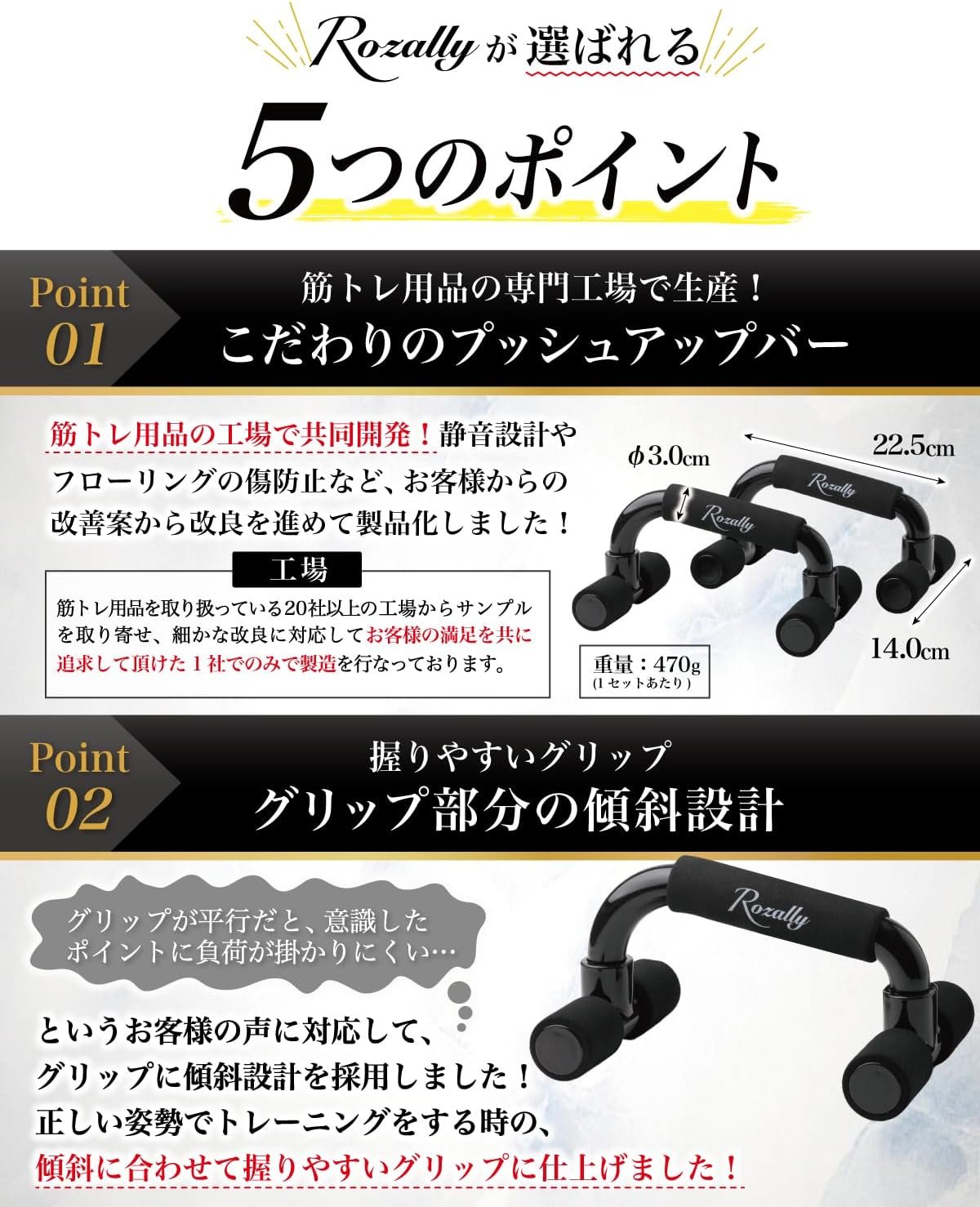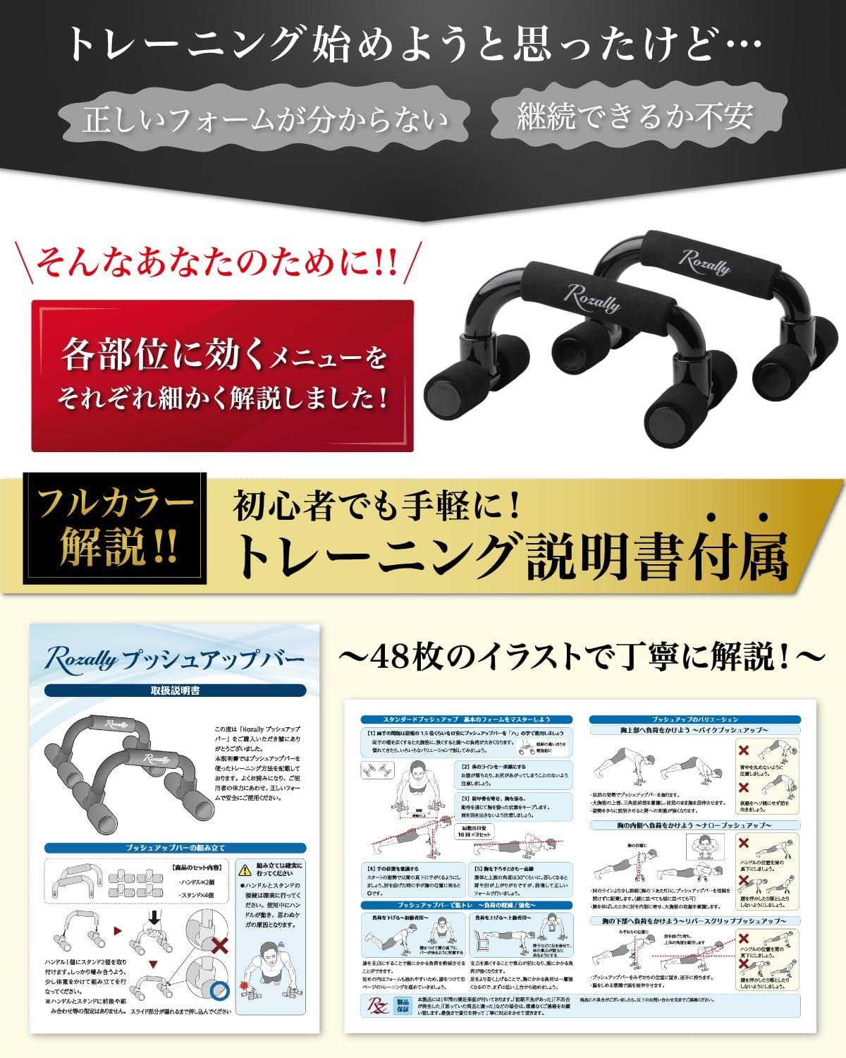 [Supervised by Active Trainer] 腕立て伏せで筋トレをする際に手首の負担を軽減するために使用するプッシュアップバーです。大胸筋や体幹強化などの腕立て伏せは、上半身を鍛えるのに効果的なトレーニングです。ただし、手首にかかる負荷を大幅に軽減する装置がないと、体重が手首に垂直にかかり、痛みを引き起こす可能性があります。本製品は、男女問わず1,500名を超える「現役トレーナー」の講師が企画・開発した、わかりやすい取扱説明書付きです。 [Precautions] 「プッシュアップバー」は様々なメーカーから販売されていますが、ロザリーのプッシュアップバーは「握りやすさ」と「静音設計」が特徴です。トレーニング用品やダイエット用品を中心に10社以上の工場からサンプルをいただいております。強度や形状も合わせて一社でオーダーしてみました。本製品は、自宅トレーニング時に大胸筋を鍛えることができる、コンパクトで組み立ても簡単な筋トレアイテムです。 (推奨)自宅や自主的に外出する機会が減り、太る可能性が減りました。そんな時におすすめなのがこのプッシュアップバーです。ボディメイクだけでなく、ダイエットやシェイプアップにも使える筋トレグッズです。魅力的な胸板を作るには、二の腕から大胸筋まで鍛えられる腕立て伏せがおすすめです。女性が魅力的な「胸」を育てるために、大胸筋を中心に上半身全体の刺激を高め、美しいバストを作ります。工具不要で簡単に組み立てられるので初心者でも安心です。 【フルカラー取扱説明書付き】初心者でも自宅トレーニングをしなくてもトレーニングを続けられるよう、まずは筋トレメニューからの解説を導入しました。筋トレがなかなか進まないポイントを48枚のイラストを使って解説しています。プッシュアップバーは体幹だけでなく大胸筋にも大きな負荷がかかる器具ですので、初めてのお客様は膝を立てる初心者メニューからスタートしていただけます。トレーニング例:ノーマルプッシュアップ、ナローシャップ、リバースプッシュアップ、レッグレイズ、プランクなど幅広い筋肉のトレーニングに。 [Training areas] 僧帽筋、二の腕、腕、腕、背中、お腹、体幹など。 [Product Design] Rozally プッシュアップバーは耐摩耗性素材で作られているので、仕事の終わりに自宅でトレーニングできます。 「静か」なものは何もありません。私たちはそれを設計しました。この商品は、従来のプッシュアップバーには耐摩耗性素材が使用されておらず、テレビを見ながらトレーニングすると音がうるさかったため、設計を見直しました。ボディメイクやフィットネスにも、初心者でも簡単に使えるトレーニング器具として人気の商品です。