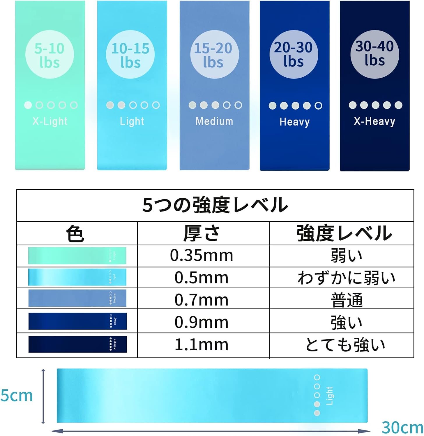 5初心者が容易にする5荷重強度:強度は色によって異なり、X -light(最も弱い) – 光(弱い) – 中(正常) – 重(強い) – X -Heavyのそれぞれが異なります。 5種類の抵抗から選択できるので、自分の抵抗に合った強度でトレーニングできます