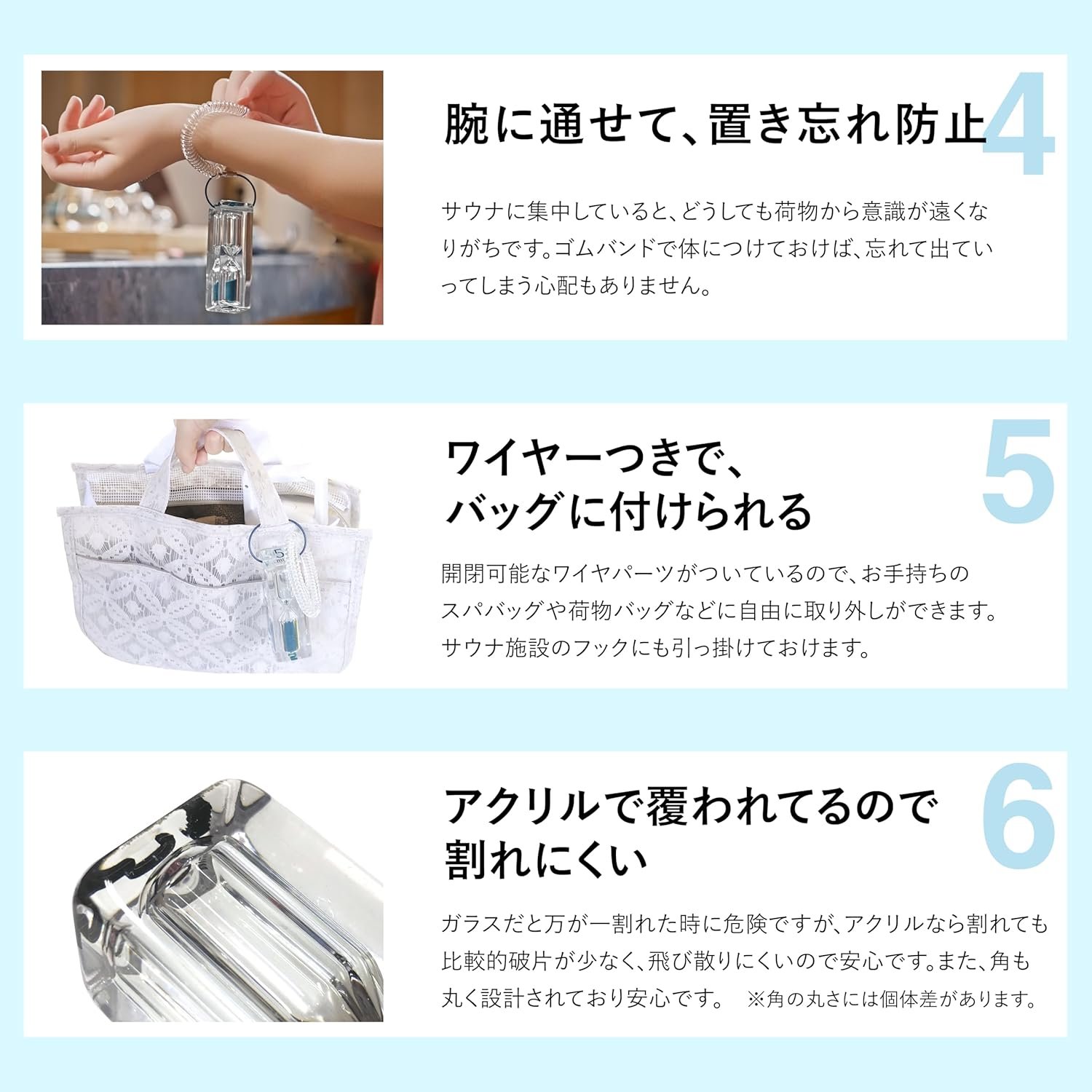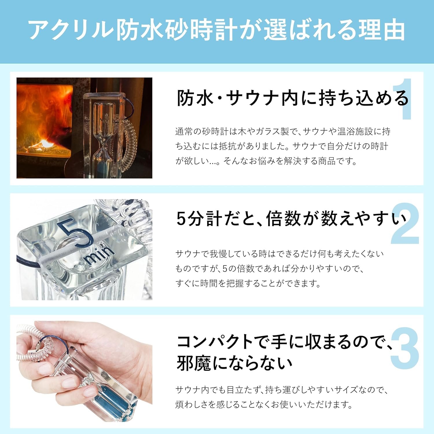 (サウナ以外に使用できる砂時計)バスタイムを追跡したり、ヘアパックを追跡したり、キッチンで使用したりするために使用することもできます。また、オブジェクトとしてスタイリッシュです。流れる砂を見ると、癒しの効果が得られます。コンパクトで持ち運びが簡単なので、バッグに取り付けることでキーチェーンとして使用できます