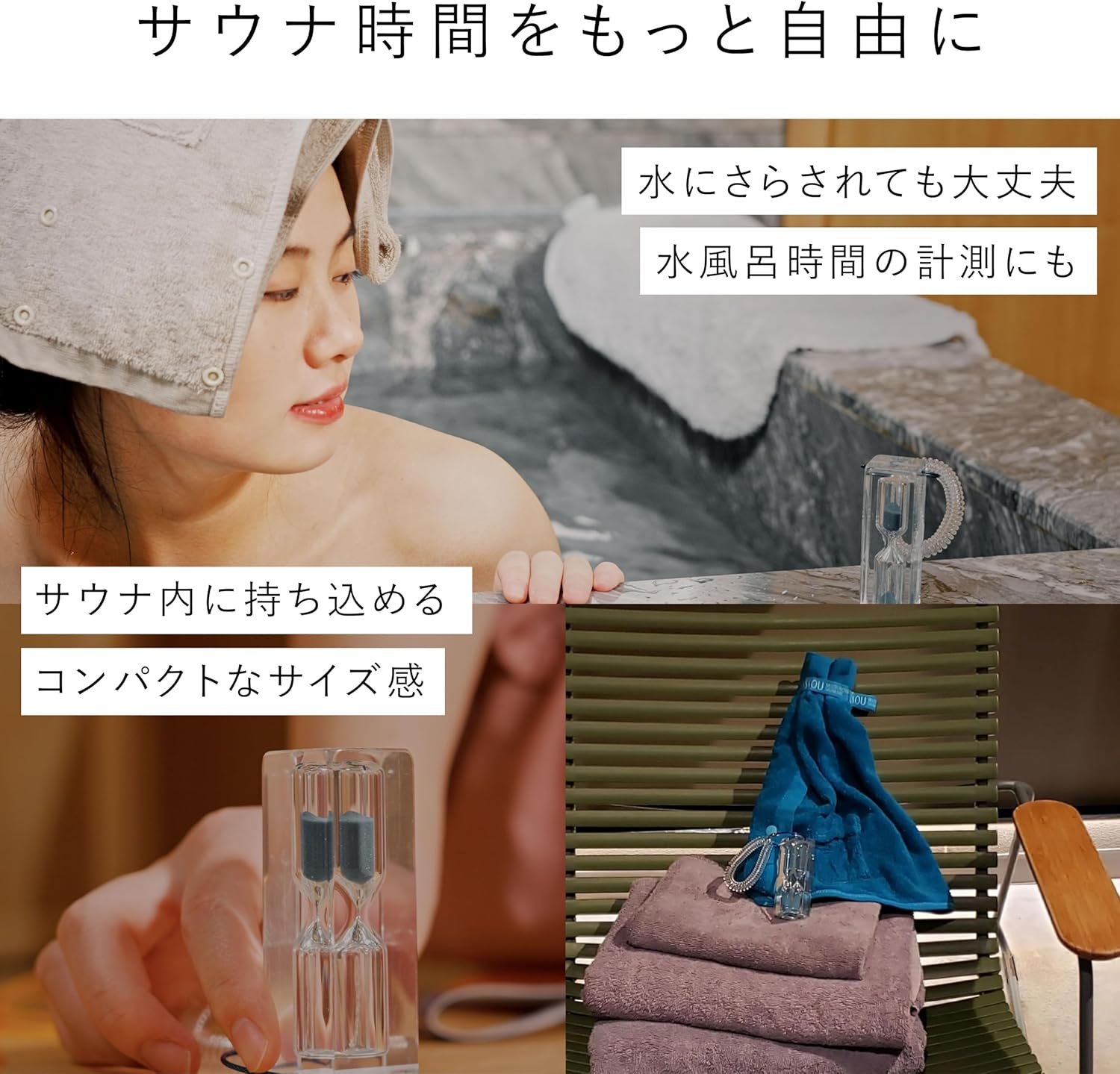 サウナ、水浴、屋外入浴での時間の管理:時間管理は、その日の状態を理解するために重要です。また、時計が見えないサウナの部屋や時計のないサウナルームに座っていたときにも便利です