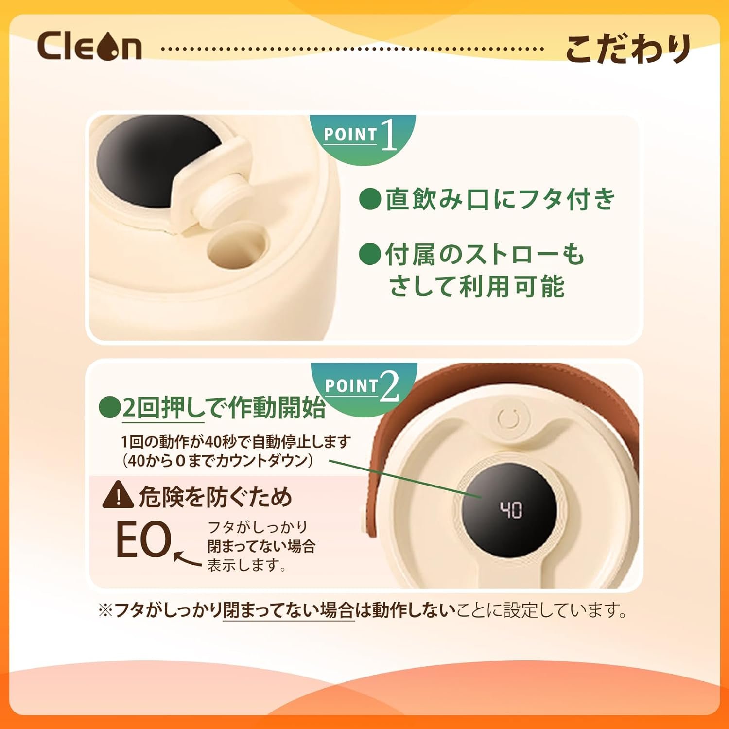 ジュースやスムージーを作るには、適切な量の水や牛乳を満たしてください。電源が接続されるかカッターが停止するまで蓋を開けないようにしてください。安全性を高めるために、充電する前にミキサーのボディとカップをしっかりと閉じてください。 Mouth.doesは、長期間継続的に動作しません。次の異常または誤動作の場合、すぐに使用します。