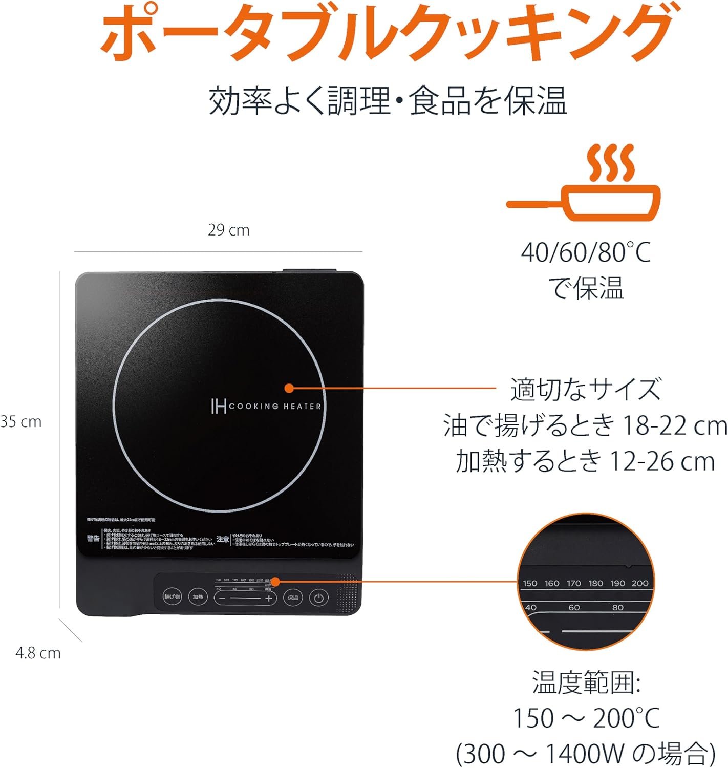 互換性のあるポットサイズ: [Heated Cooking] 直径4.7-10.2インチ(12-26 cm); [Fried Food] 直径7.1-8.7インチ(18-22 cm)