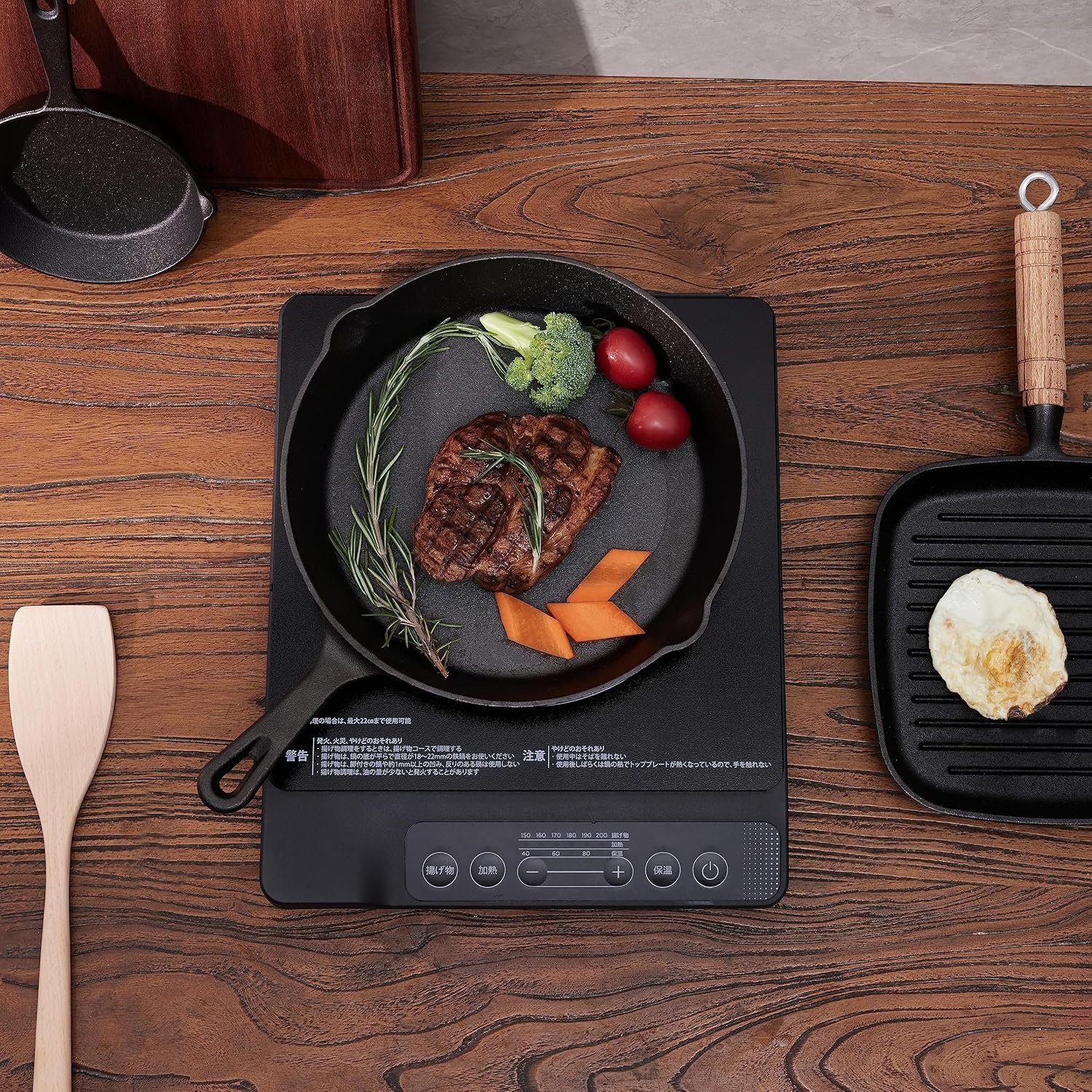 揚げ物、揚げ物、鍋料理、蒸し食品など、さまざまなレパートリーを楽しむことができます。6レベルの熱と温度(火力:300 W-1400W、温度:350-200°C)で調整できます。 3レベルの熱保持機能(104/14/14.0/176°F(40/60/80°C)