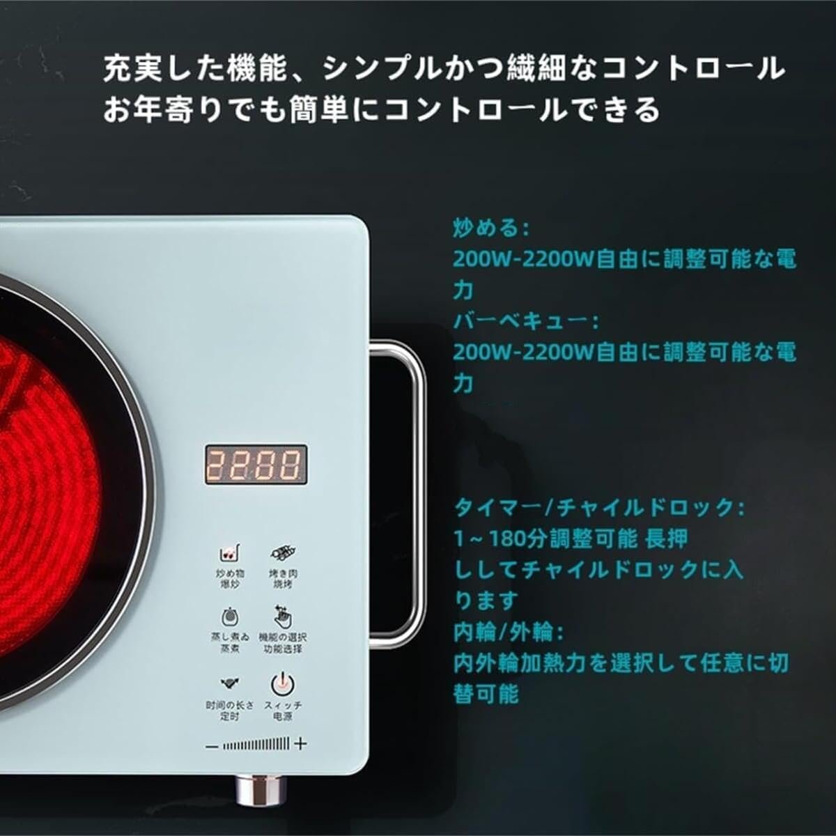 2。2200Wの高出力、大きなコイルが迅速かつ均等に加熱されます。エレクトリックストーブは、伝統的な電気ストーブよりも速く調理し、食べ物を摂取することが少ない