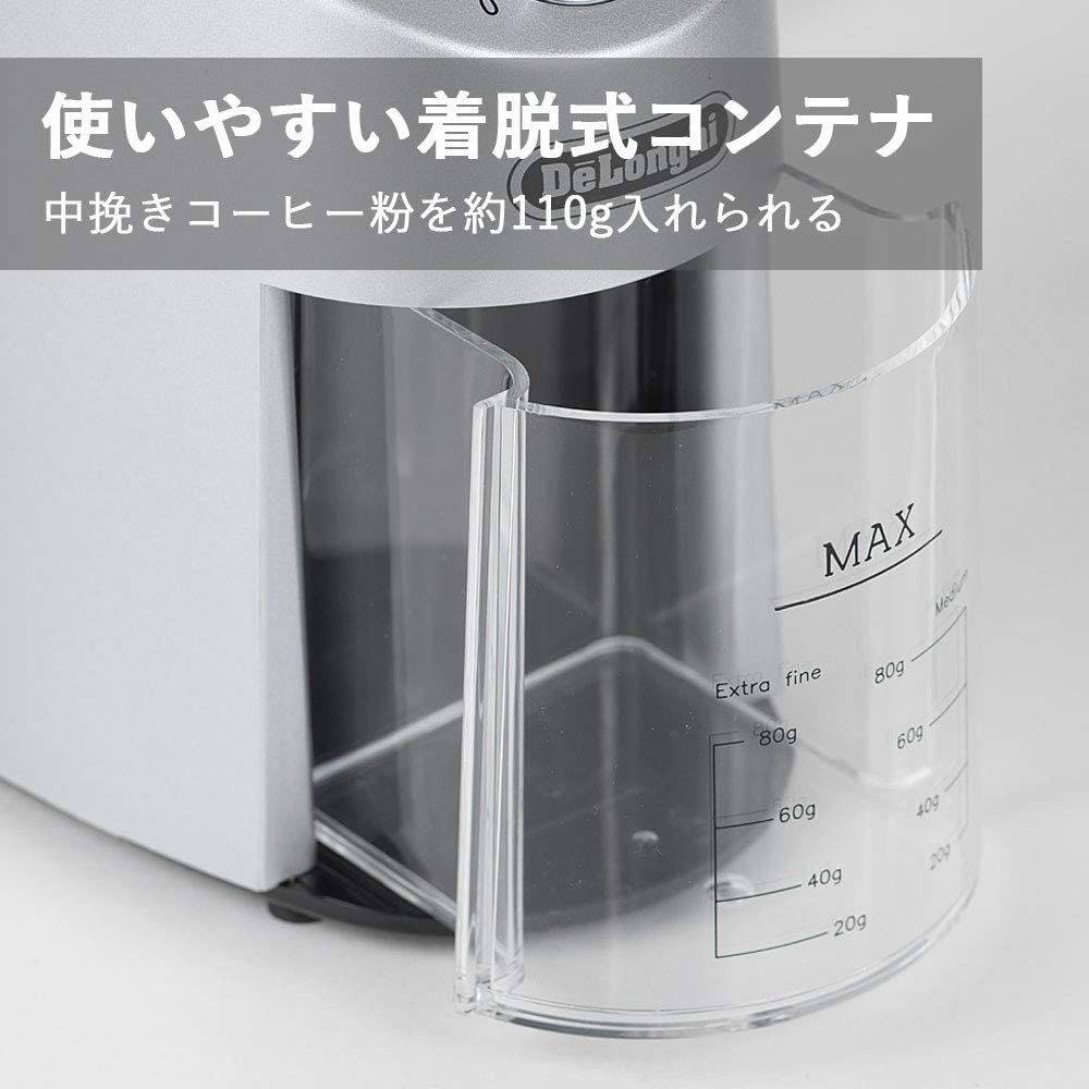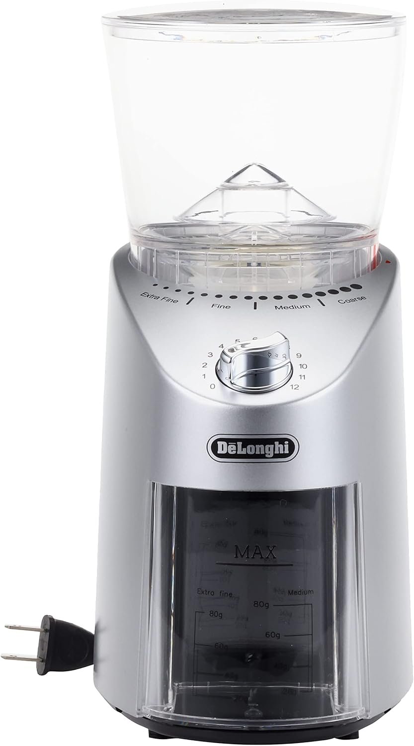 De’longhi KG366Jコーヒーグラインダー、トウモロコシタイプ、10.1オンス(310 g)のコーヒー豆、安全なデザイン、中程度から余分な細かいグラインド、16粒度、ゆっくりと研削、低摩擦熱、パワーコードホルダー(シルバー)