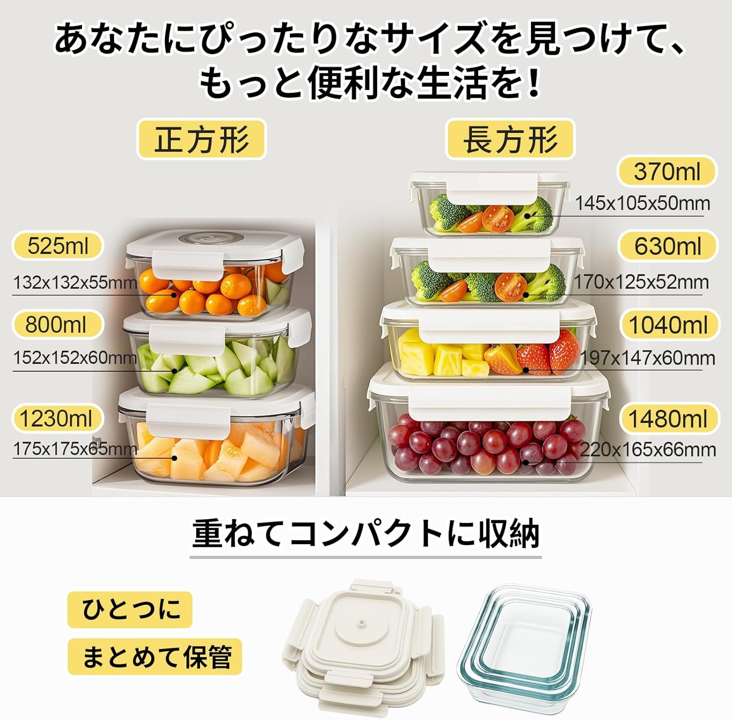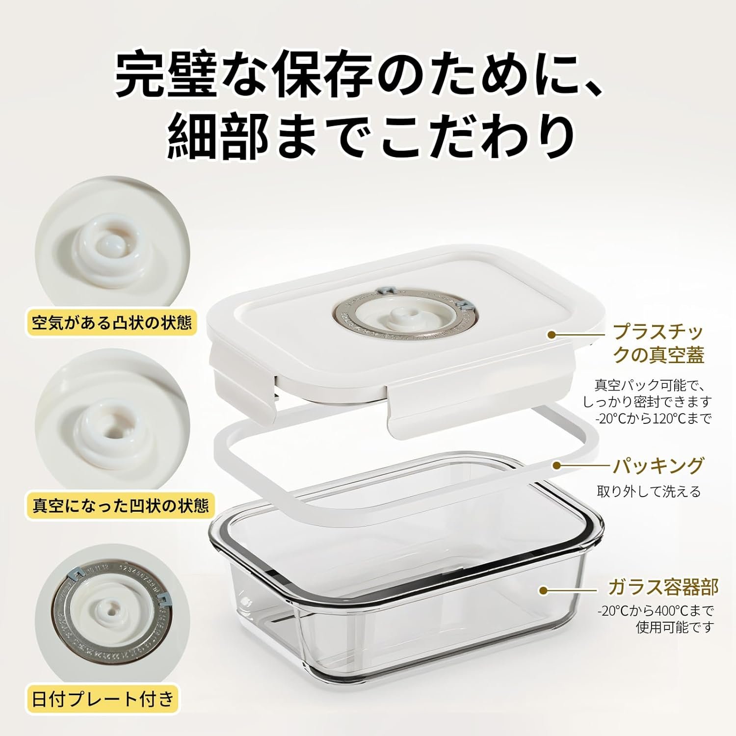 食物の臭気が移動するのを防ぎます:真空設計により、臭気が食物に移動するのを防ぎ、各食物の味を保護します。冷蔵庫を新鮮で清潔に保ちます。高品質のガラス材料で作られているため、中身を確認し、簡単に食べ物を取り出すことができます