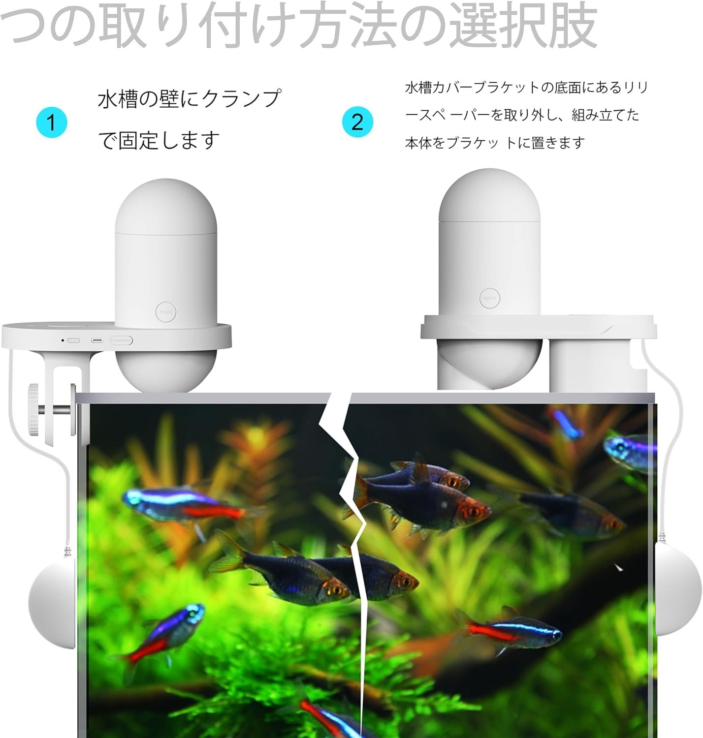 【2設置オプション】2つのインストール方法と電源:調整可能なクリップを使用して水族館の端に固定するか、付属のシールを使用してタンクの蓋に取り付けます。ほとんどの正方形の水族館に適しています。 Wi-Fiフィッシュフィーダーは、USBケーブルで接続して、自宅で動作する(5フィートのUSBケーブルが付属)、またはパワーバンクを搭載することもできます。