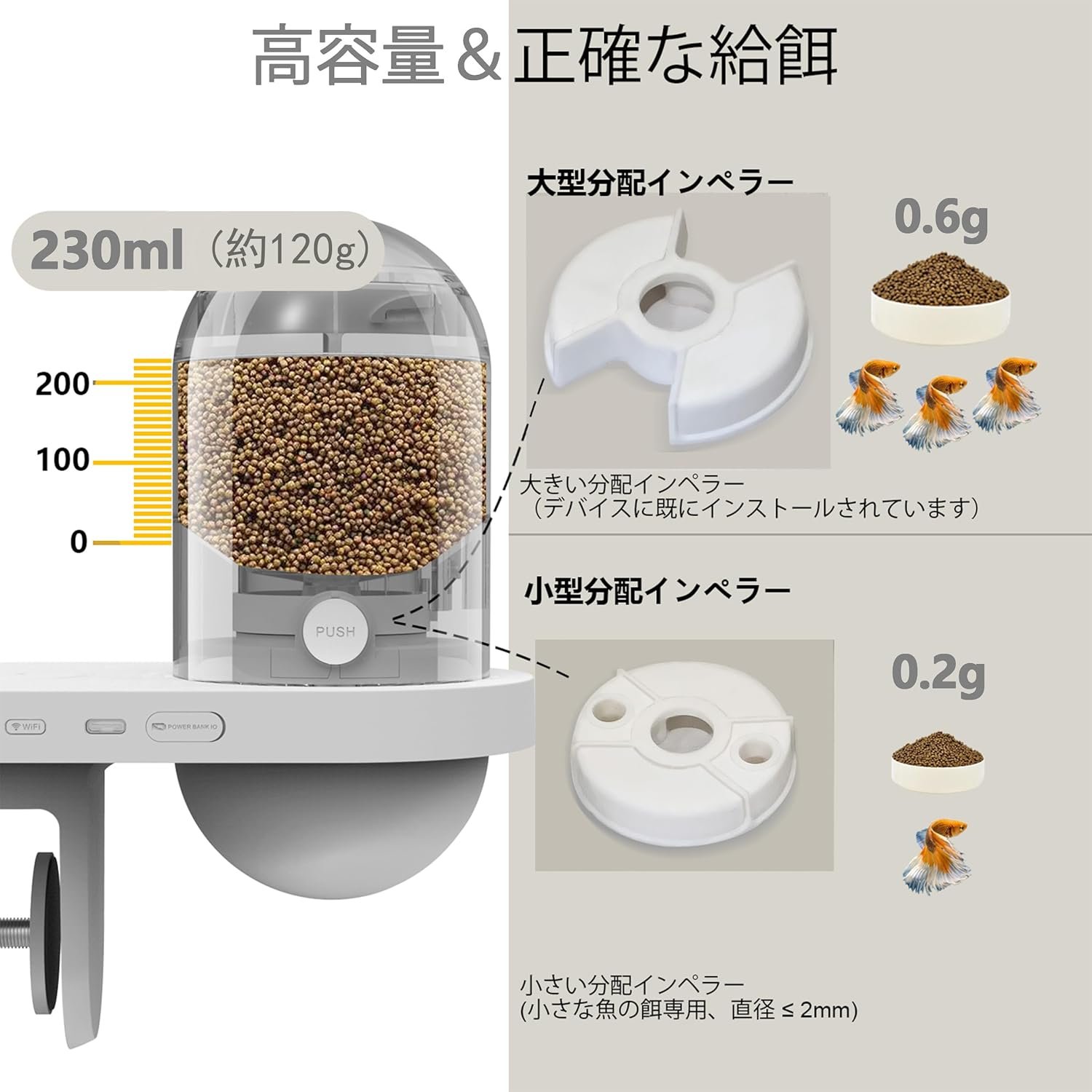 (8.1 fl oz(230 ml)の大容量と餌を新鮮に保ちます:自動魚フィーダーは、水分を防ぎ、詰まりを防ぐために更新されます。230mlの大容量容器は、ペレット、顆粒、粉末などのさまざまな魚の餌に使用できます。餌の上部を補充する必要はありません