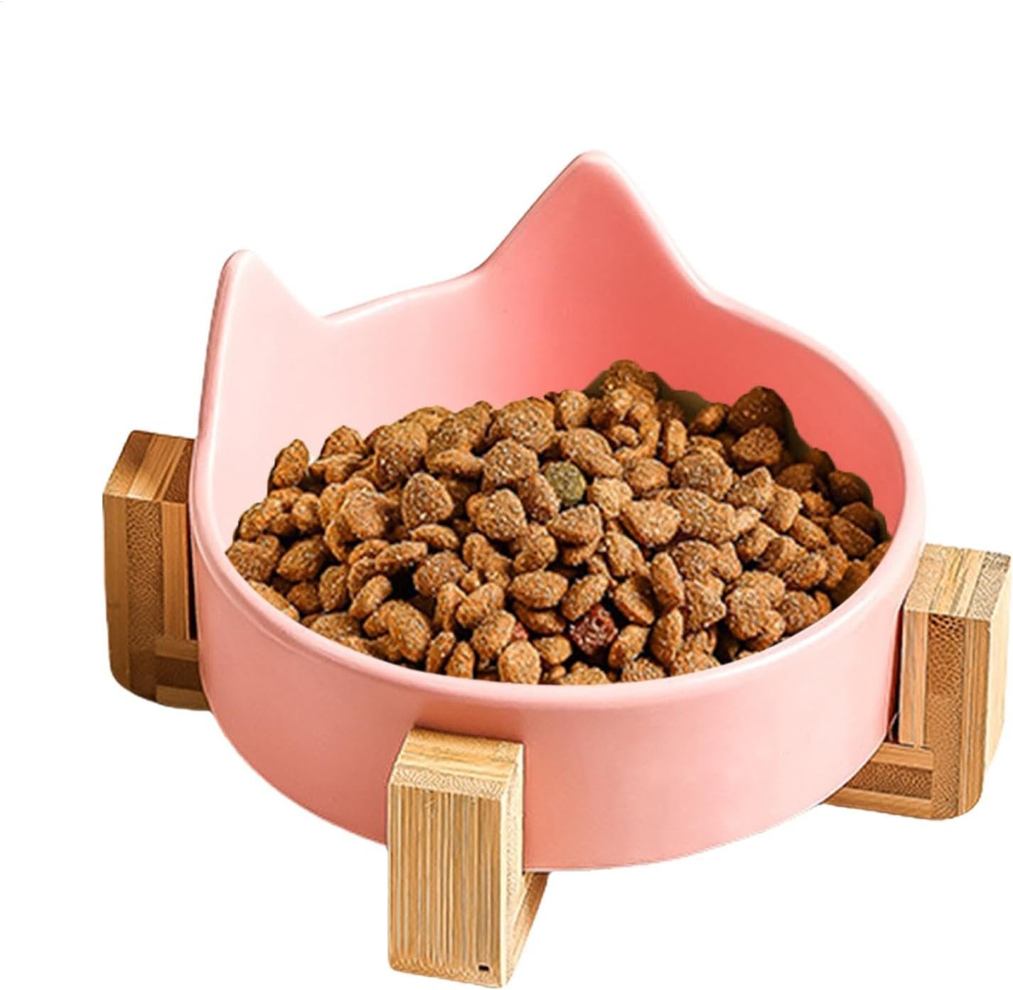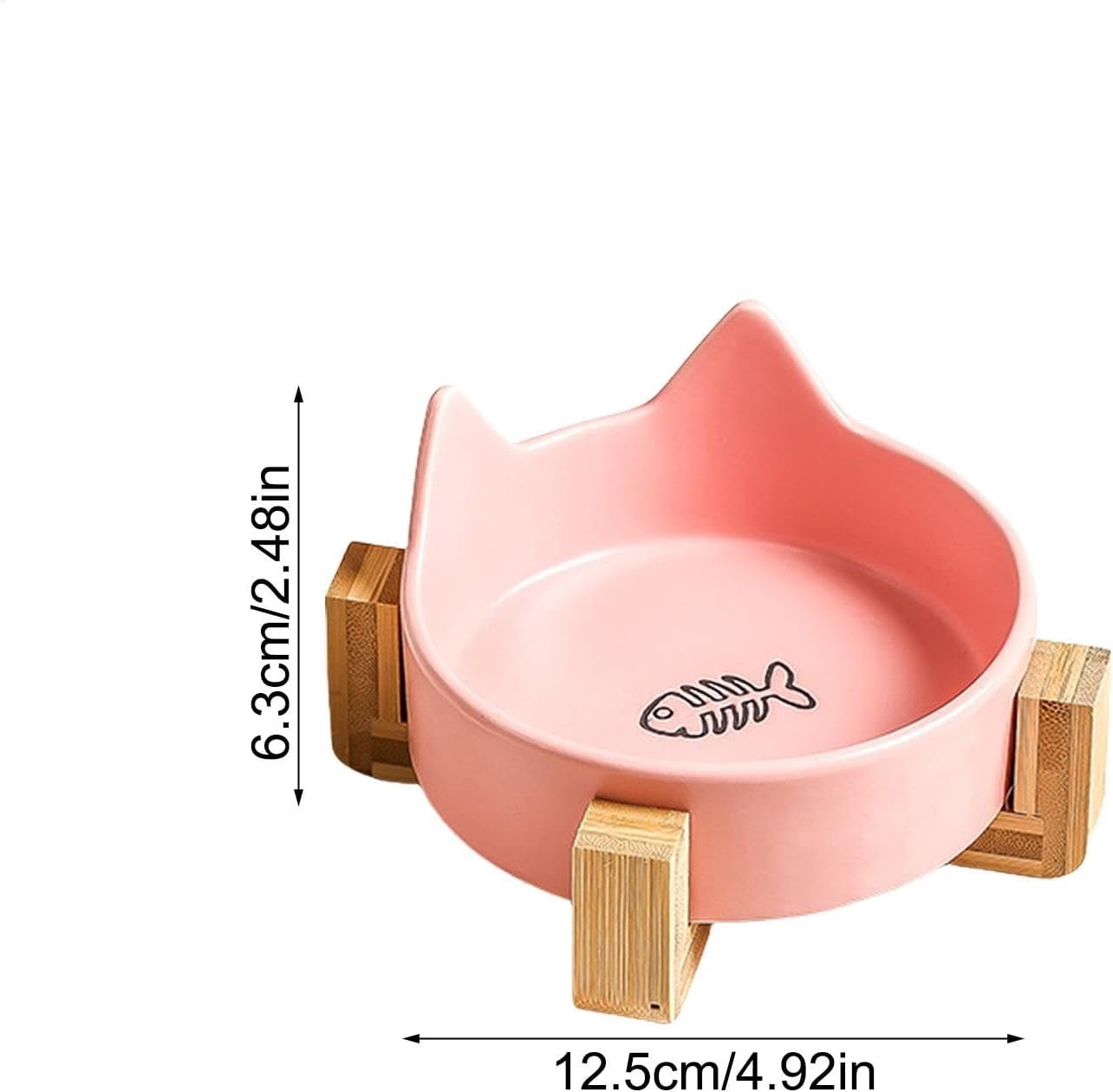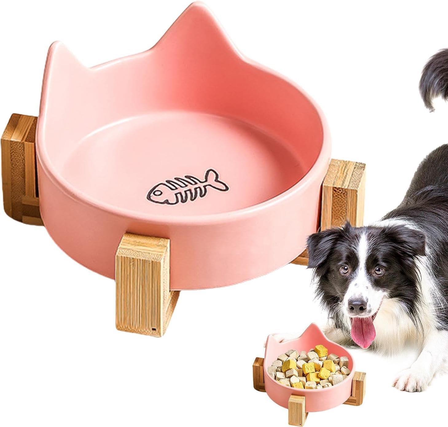 滑り止めの木製スタンドと猫のボウル|かわいい猫の耳の形状セラミックキャットフードボウル|フィッシュボーンパターンでこぼすプルーフデザインペットボウル|犬と猫のための大容量のペットボウル