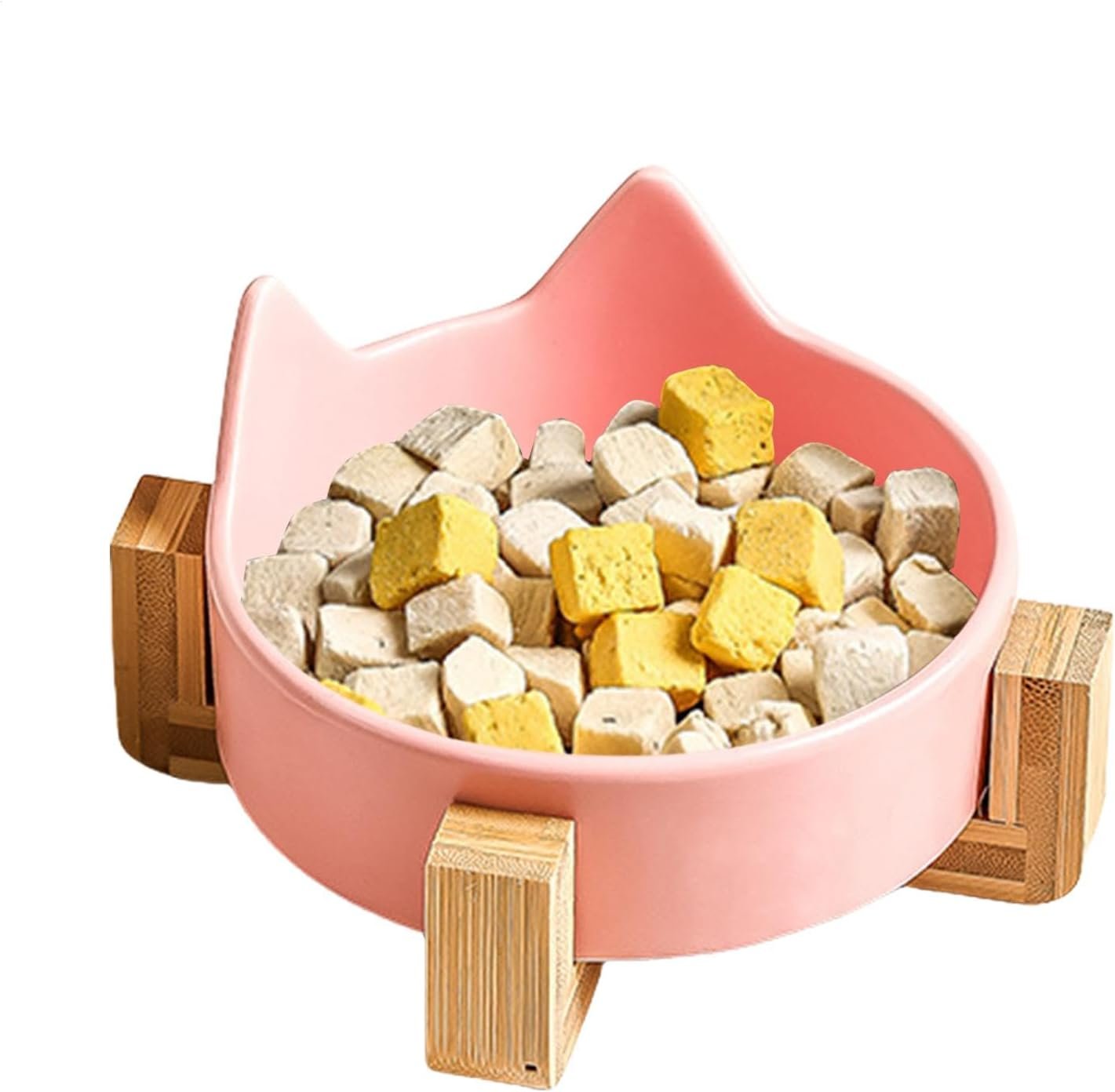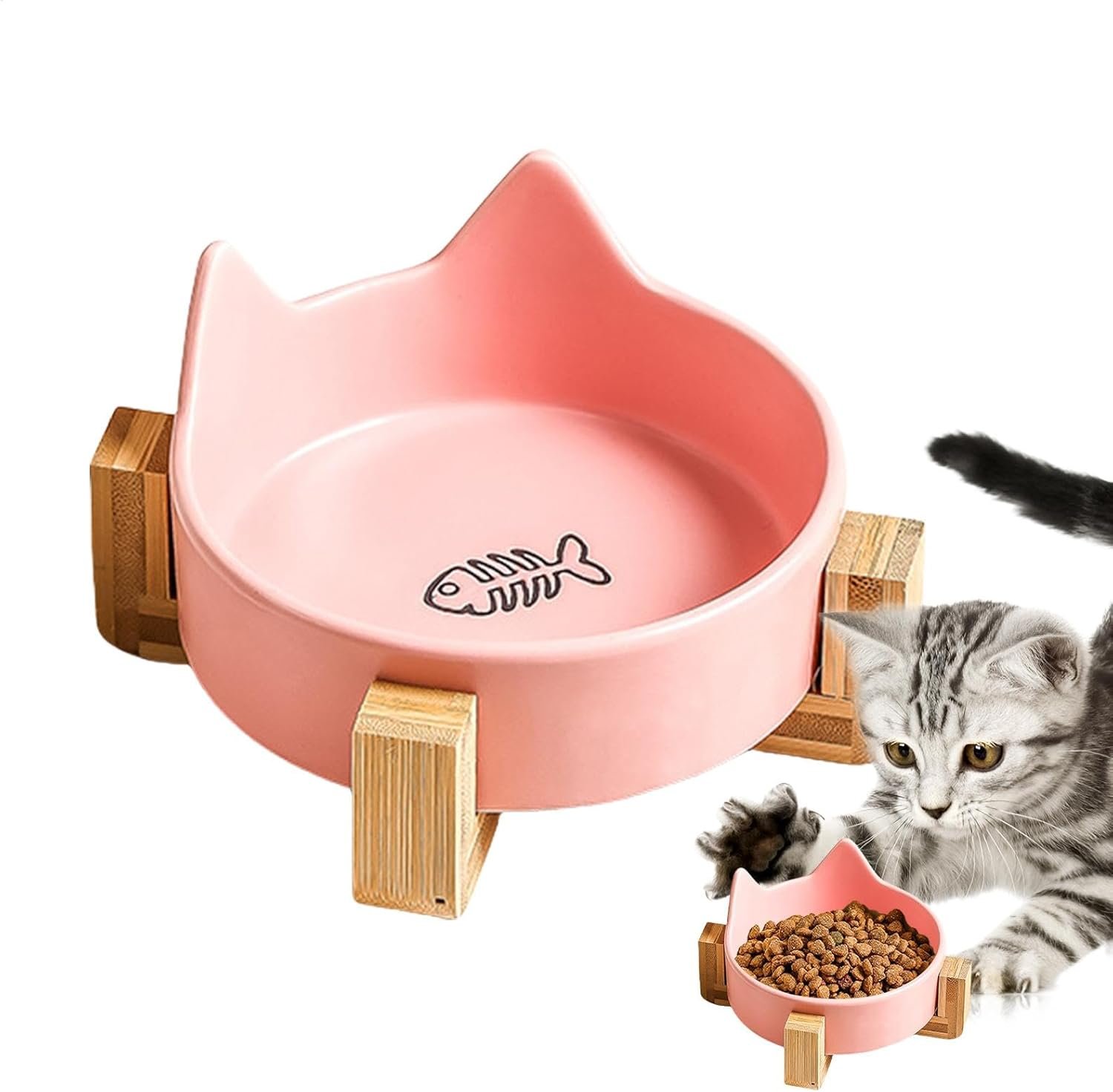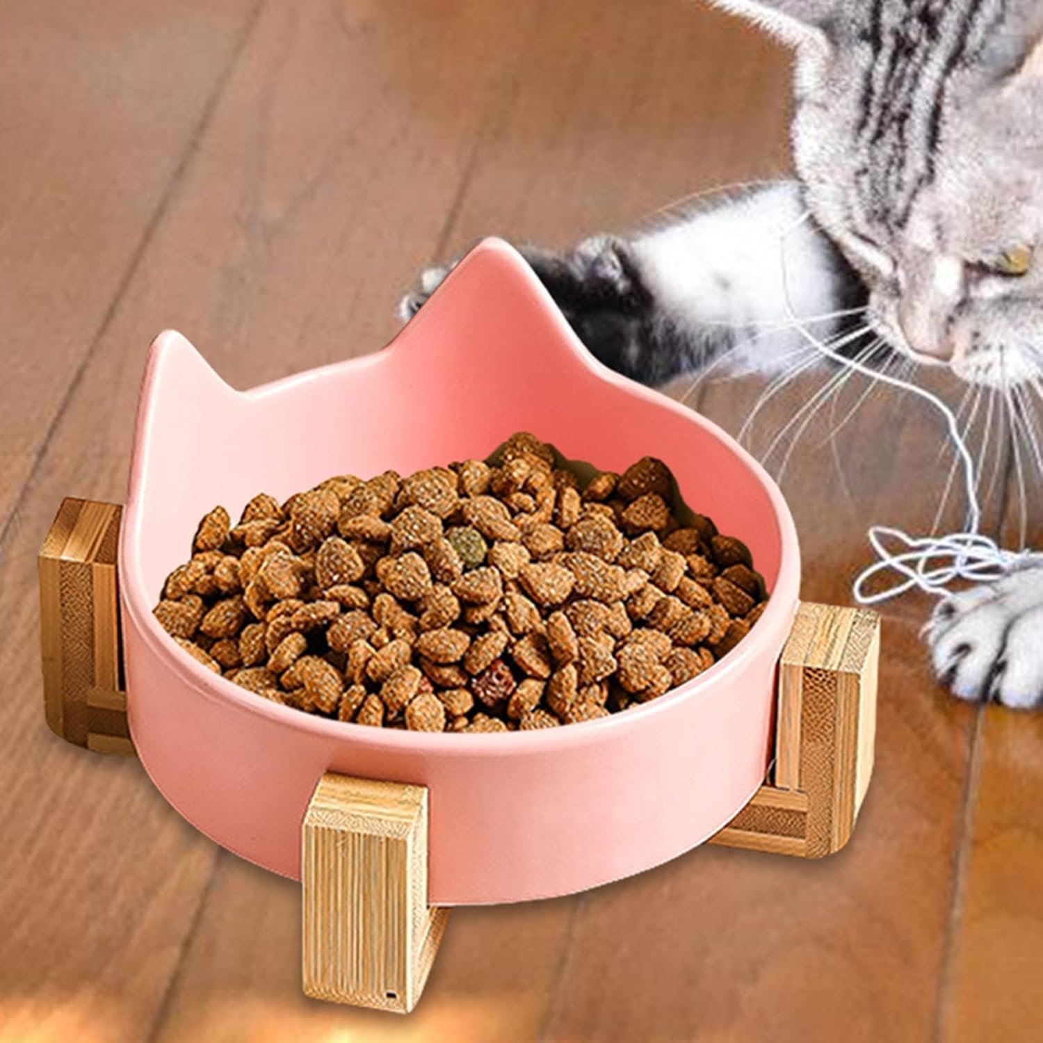 滑り止めの木製スタンドと猫のボウル|かわいい猫の耳の形状セラミックキャットフードボウル|フィッシュボーンパターンでこぼすプルーフデザインペットボウル|犬と猫のための大容量のペットボウル